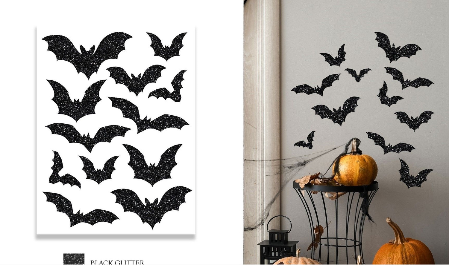 Zestaw dekoracyjnych naklejek ściennych w kształcie nietoperzy z brokatowym efektem to idealna ozdoba na Halloween. Dzięki połyskującym drobinkom tworzą wyjątkową, tajemniczą atmosferę, doskonale prezentując się na ścianach, drzwiach, meblach czy oknach. Każdy nietoperz ma inaczej ułożone skrzydła co dodaje dynamizmu dekoracji. Nietoperze są niezależne od siebie, lekkie, łatwe w montażu.