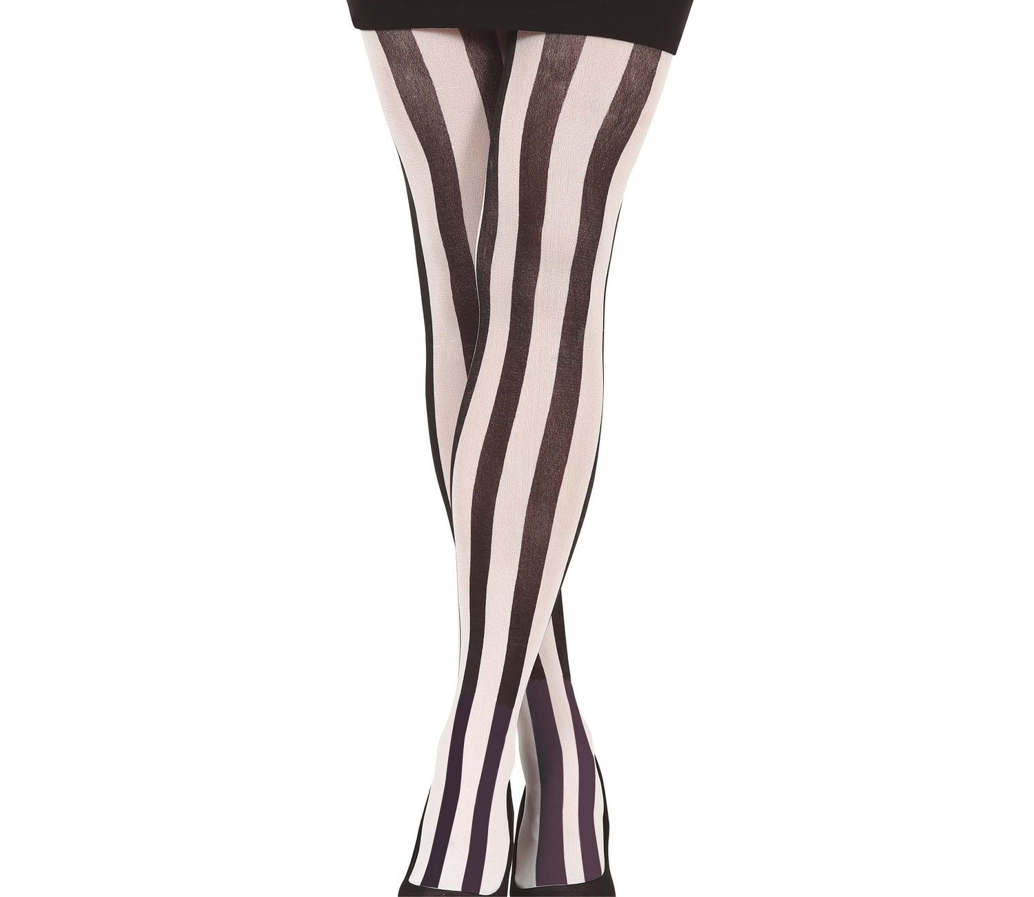 • Rajstopy w biało-czarne pionowe pasy. Nadruk z przodu, tył gładki biały. Rozmiar uniwersalny - pasuje na większość osób. Super dodatek do stroju Beatlejuice, więźniarki czy piratki.