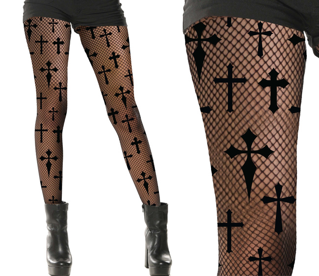 - Rajstopy czarne kabaretki ze wzorem w gotyckie krzyże. Rajstopy mają bezszwowe nogawki, zakończone przy palcach szwem. Nie posiadają klina, ani stopki. Idealny dodatek do stroju wampirzycy, rockmanki czy buntowniczki.