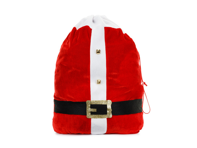 • Zachwycający worek w świątecznym stylu, który wygląda jak strój Świętego Mikołaja! Ozdobiony aplikacjami w stylu pasa ze złoceniami oraz dwoma dzwoneczkami.
