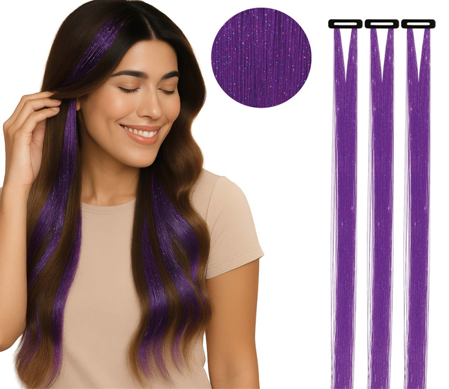 - Fioletowe pasemka do włosów to Twój sekretny sposób na efekt WOW. Pasemka wczepiane są na spinkę z grzebyczkiem. Sztuczne włosy są w kolorze fioletowym z holograficznym połyskiem. Opakowanie zawiera 3 sztuki.