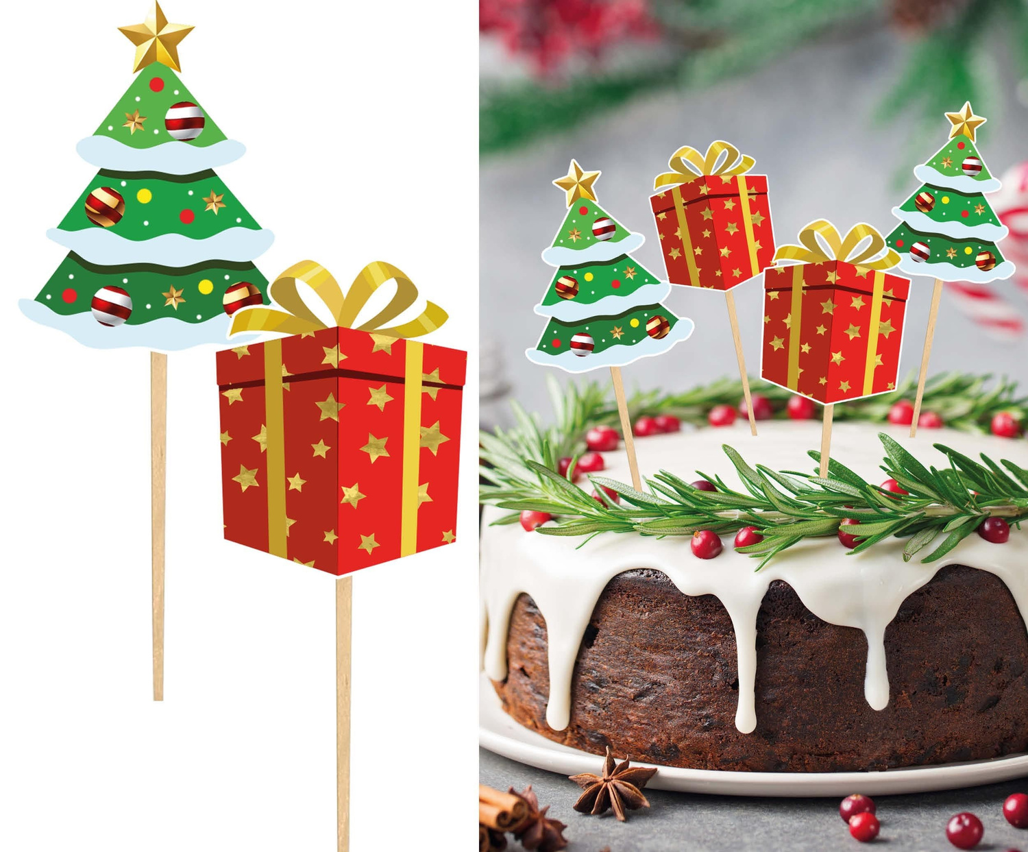 Zestaw pikerów bożonarodzeniowych do dekoracji świątecznych wypieków. Dekoracje wykonane są z tektury w kształcie prezentu z kokardą oraz choinki. Tekturki umieszcza się na drewnianych wykałaczkach o długości 10cm, przy pomocy dołączonego kleju. Nadruk jednostronny, tył biały. Toppery znakomicie sprawdzą się także jako element dekoracji np. stroika świątecznego lub inscenizacji.