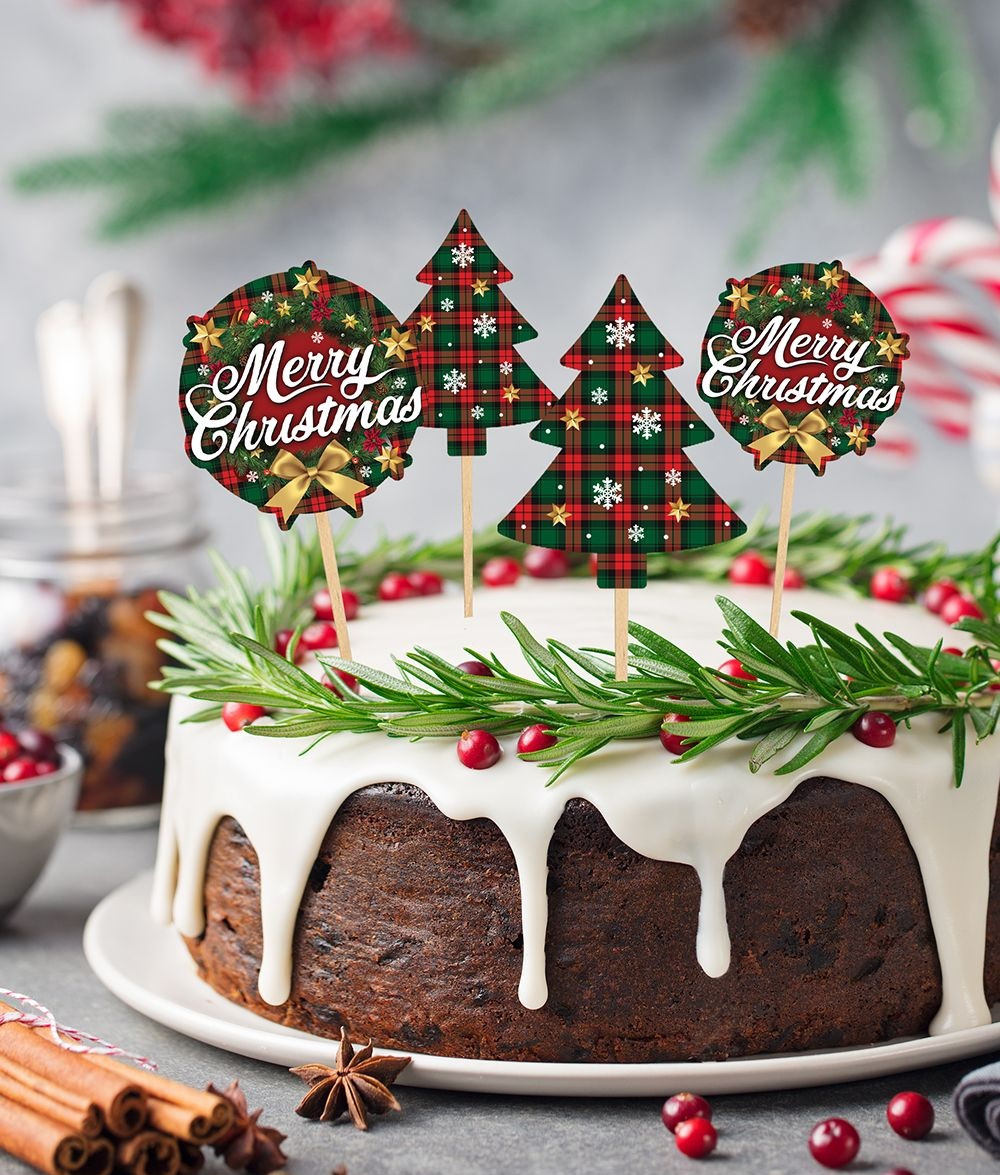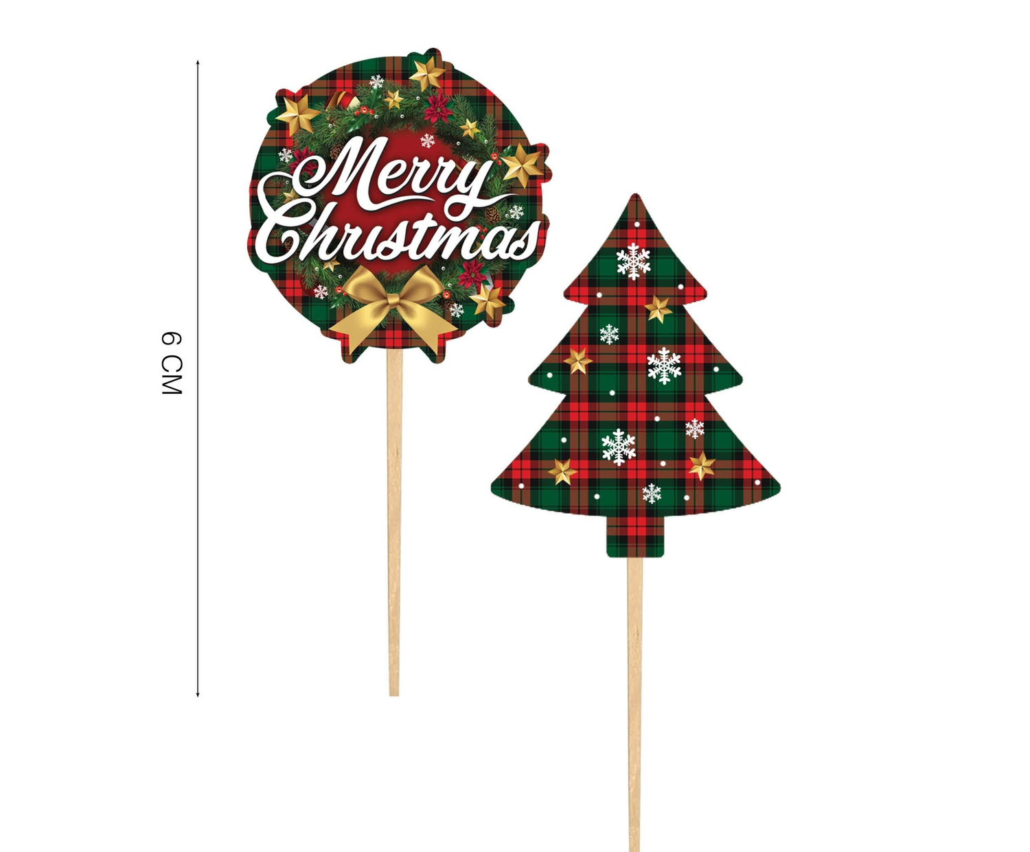 Zestaw pikerów bożonarodzeniowych do dekoracji świątecznych wypieków. Dekoracje wykonane są z tektury w kształcie choinki oraz świątecznego wieńca z napisem Merry Christmas. Całość utrzymana w czerwono - zielonej kolorystyce w kratkę, ozdobione gwiazdkami i śnieżkami. Tekturki umieszcza się na drewnianych wykałaczkach o długości 10cm, przy pomocy dołączonej taśmy. Nadruk jednostronny, tył biały. Toppery znakomicie sprawdzą się także jako element dekoracji np. stroika świątecznego lub inscenizacji.