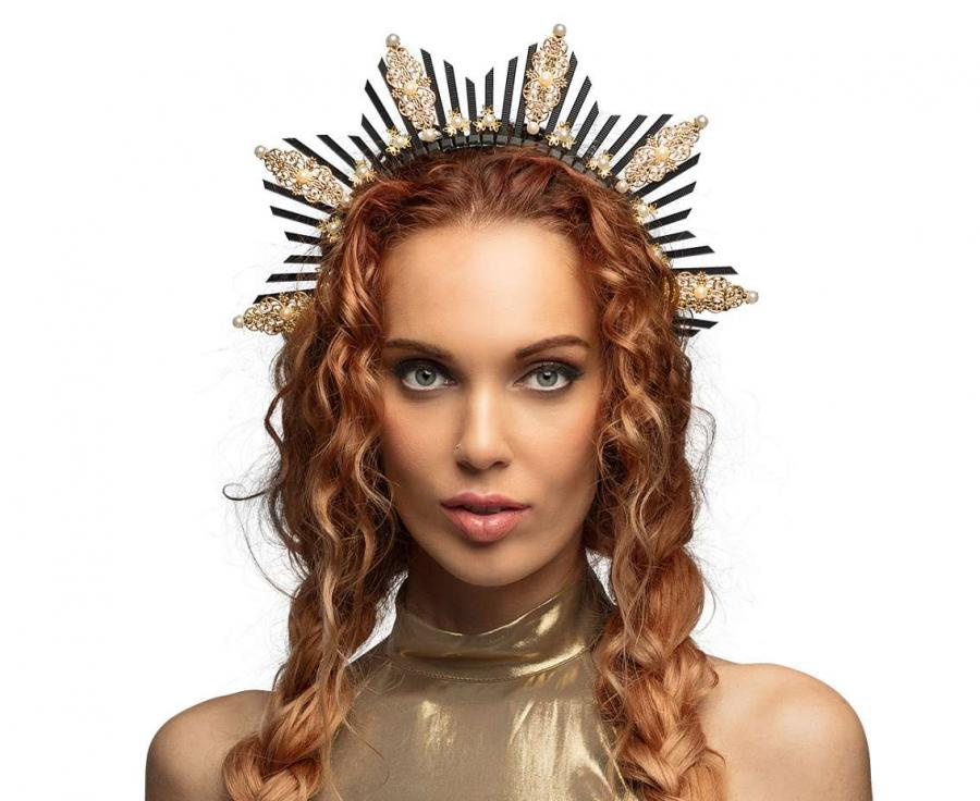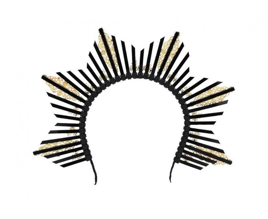 - Opaska do włosów która tworzy koronę z czarnymi promieniami, ozdobiona złotymi detalami i perełkami.