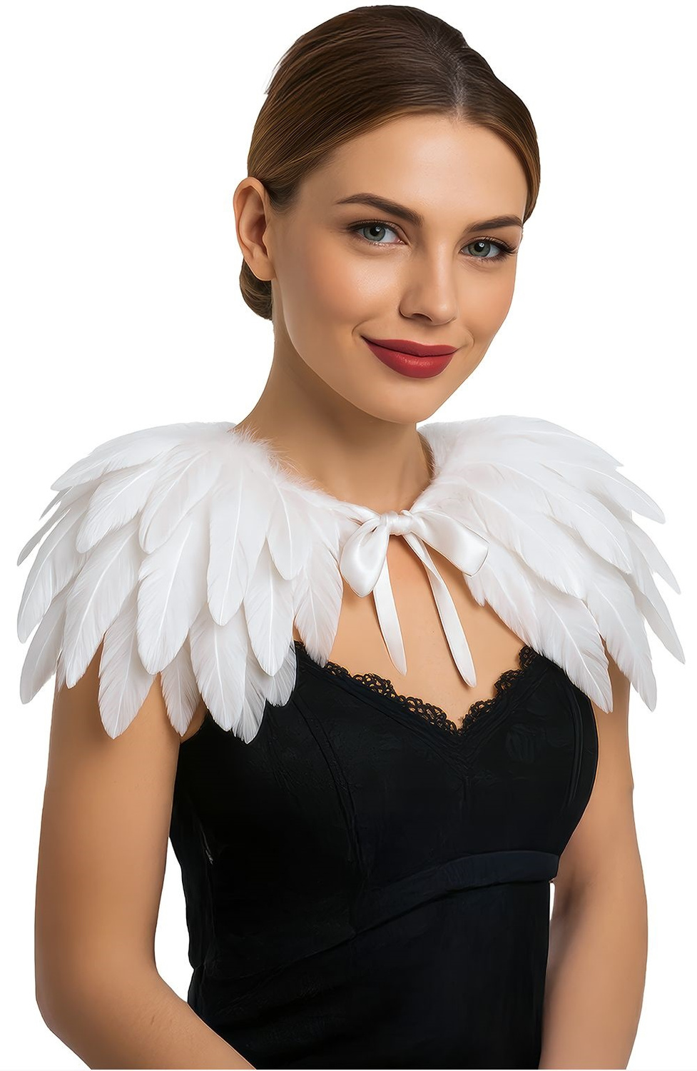 - Peleryna z białych piór wiązana pod szyją satynową wstążeczką. Idealna w stylizacji anioła, łabędzia lub innego białego ptaka.