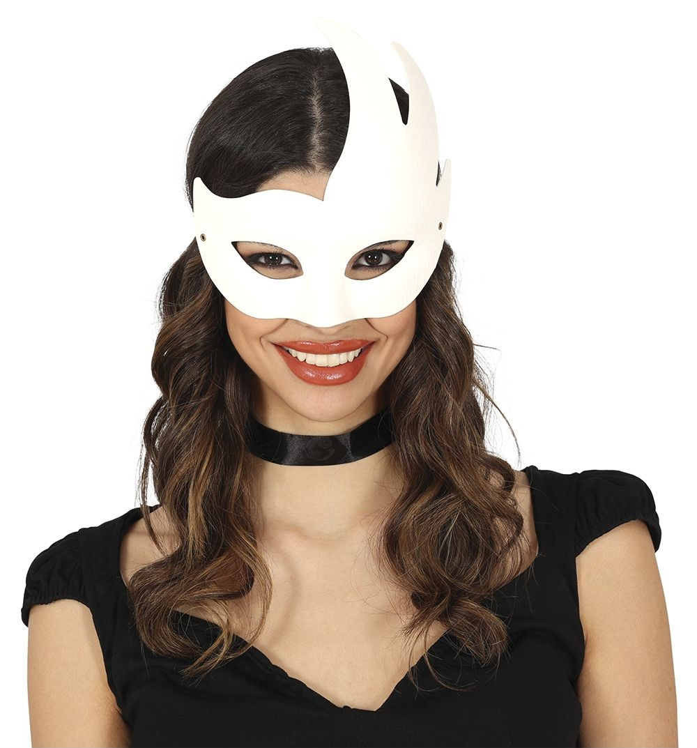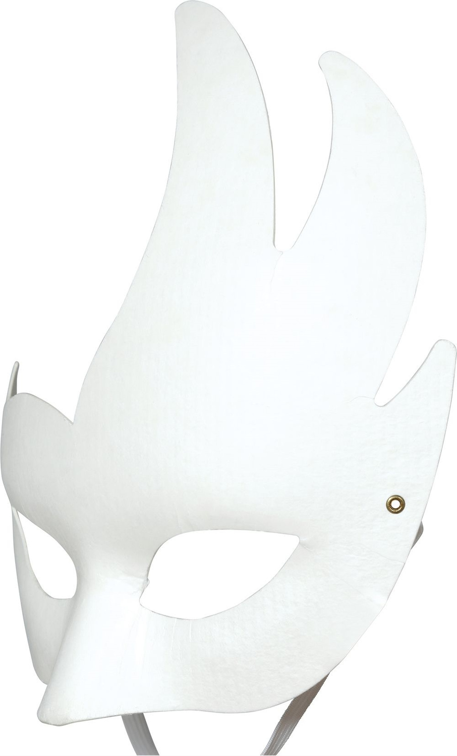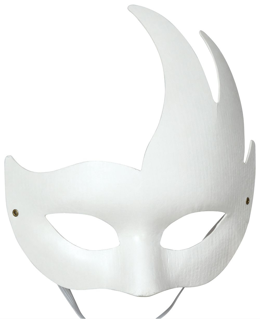 • Maska wykonana z papieru tekturowego w białym kolorze. Maska jest wyprofilowana z wyciętymi otworami na oczy, dziurki w nosie oraz usta. Maska zakrywa twarz, nie zakrywa tyłu głowy. Mocowana na gumce.