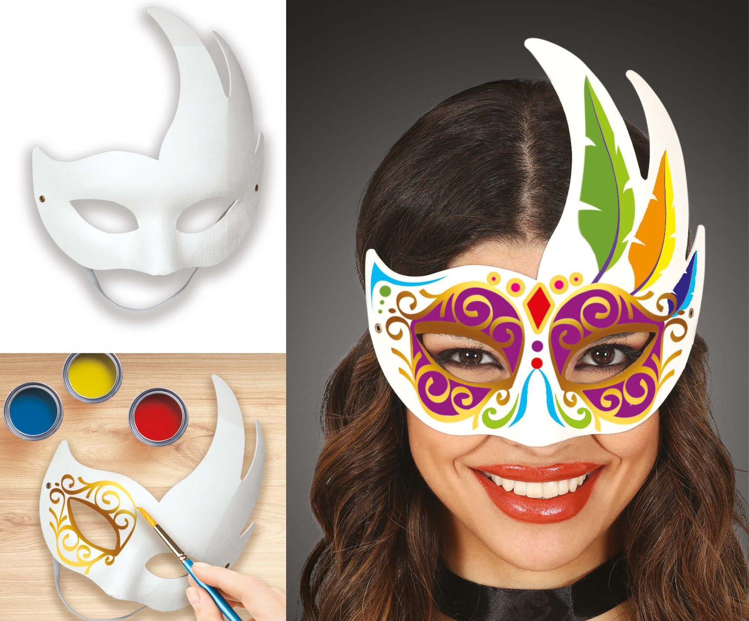 Maska w stylu weneckim wykonana jest z papieru tekturowego w białym kolorze. Maska jest wyprofilowana z wyciętymi otworami na oczy, posiada dekoracyjny kształt nad lewą częścią czoła. Maska mocowana na gumce. Może być noszona biała lub można ją udekorować według własnego uznania farbami, pisakami czy kreatywnymi aplikacjami w postaci piór, cekinów lub innych ozdób.