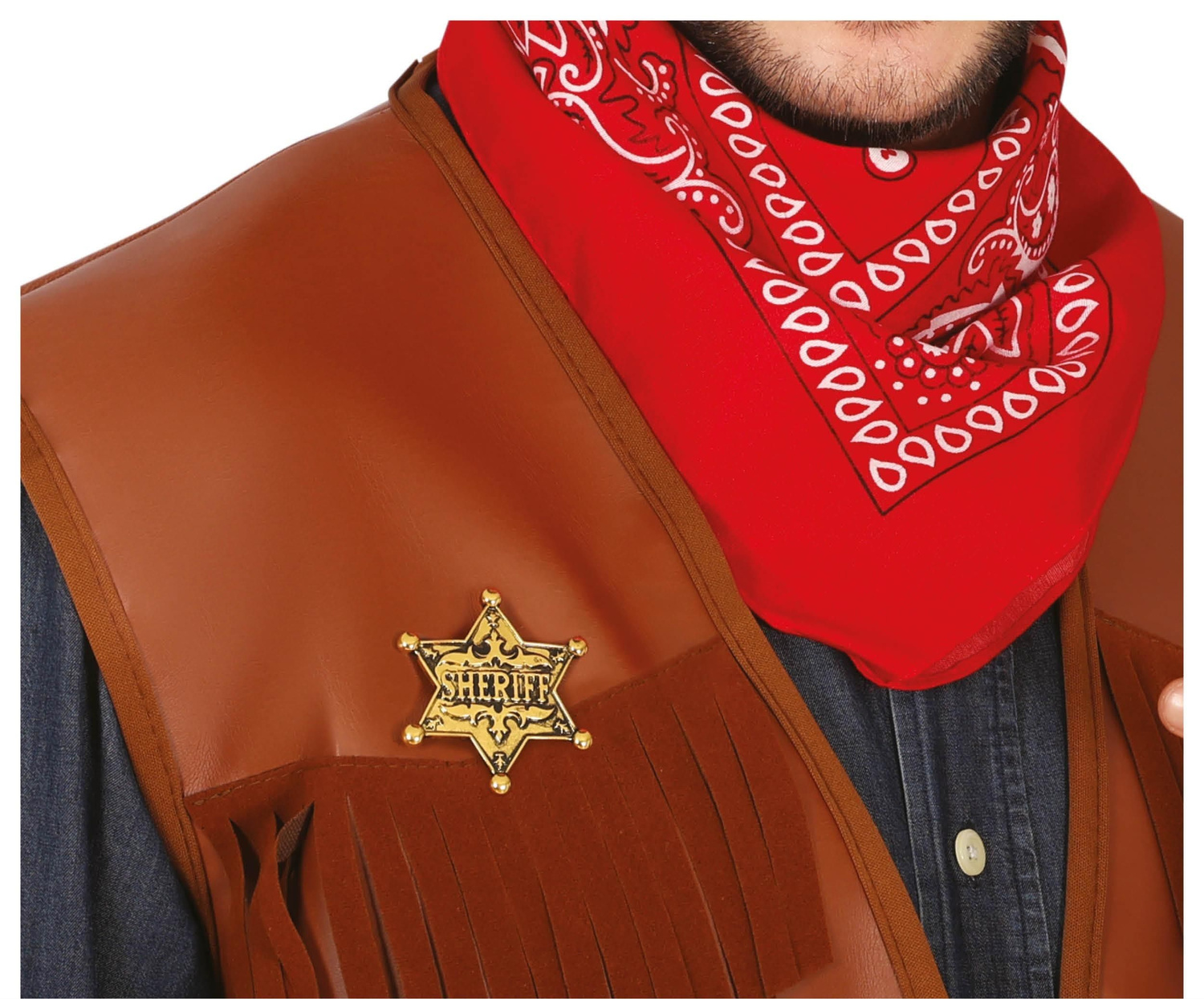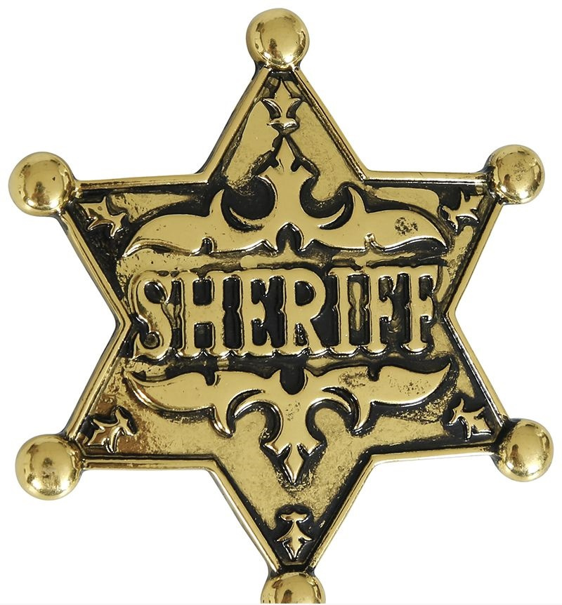 - Metalowa odznaka w kształcie gwiazdy w złotym kolorze. Na plakietce napis SHERIFF. Niezbędny dodatek do stroju kowboja - szeryfa pilnującego porządku na Dzikim Zachodzie. Odznaka zapinana jest jak broszka na agrafce.