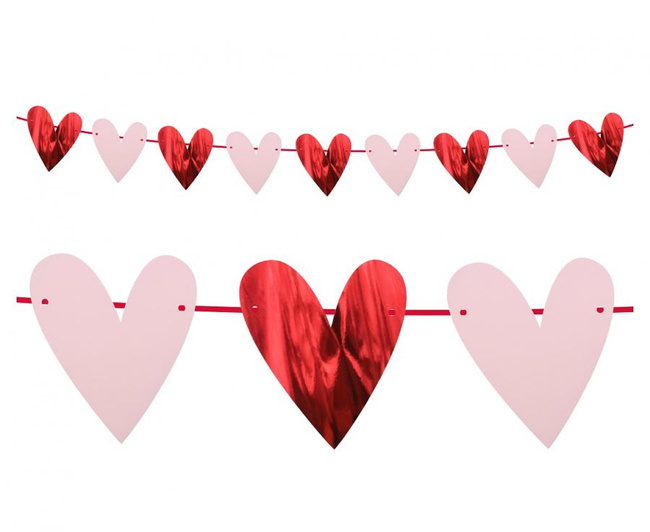 Romantyczna girlanda dekoracyjna z serduszkami w kolorze pudrowego różu i błyszczącej czerwieni to idealny dodatek na Walentynki, rocznicę, wieczór panieński lub romantyczną kolację. Pozioma girlanda wykonana z tekturek w kształcie serduszek, które są ze sobą połączone i umieszczone na czerwonej, satynowej wstążce. Kolory nawlekane na przemienne: serca w kolorze czerwonym (błyszczące) i różowym (matowe). Nadruk na tekturkach jednostronny, tył biały.