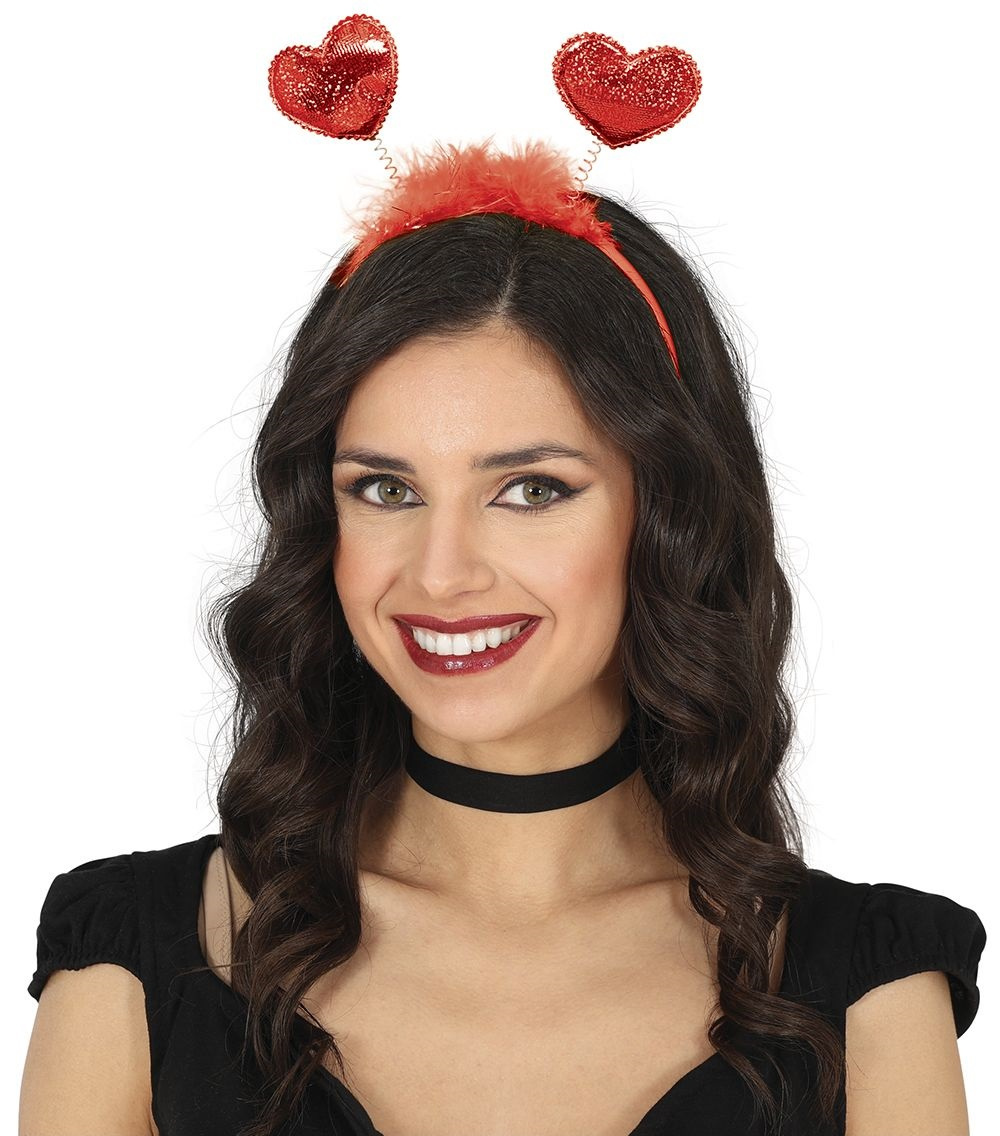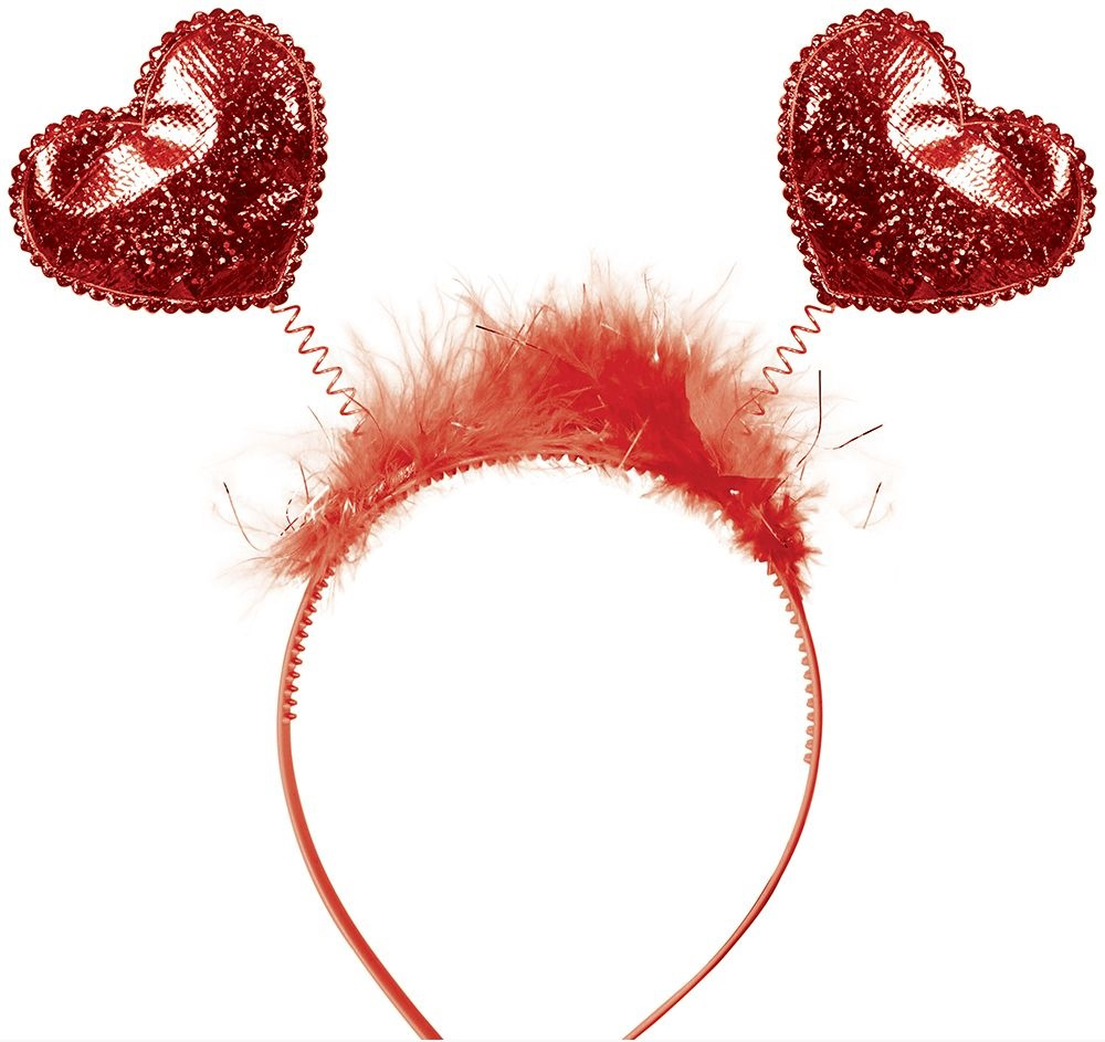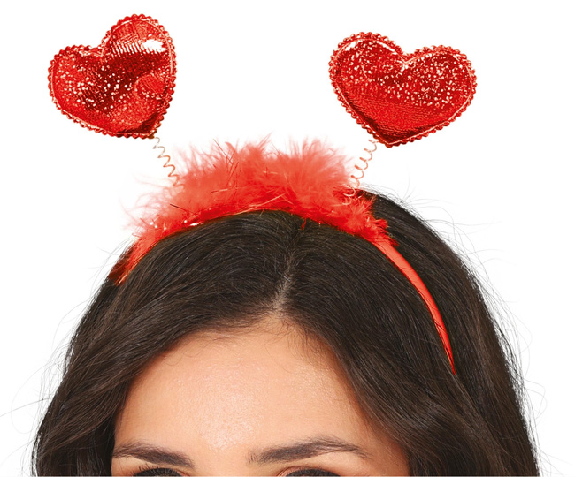 Plastikowa opaska do włosów w czerwonym kolorze. Na szczycie opaski przyczepione są na sprężynkach dwa serduszka, które od frontu pięknie połyskują, jakby były pokryte brokatem. Od tyłu gładkie, czerwone matowe. U podstawy dodatkowo ozdobiona czerwonymi piórkami boa.