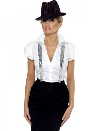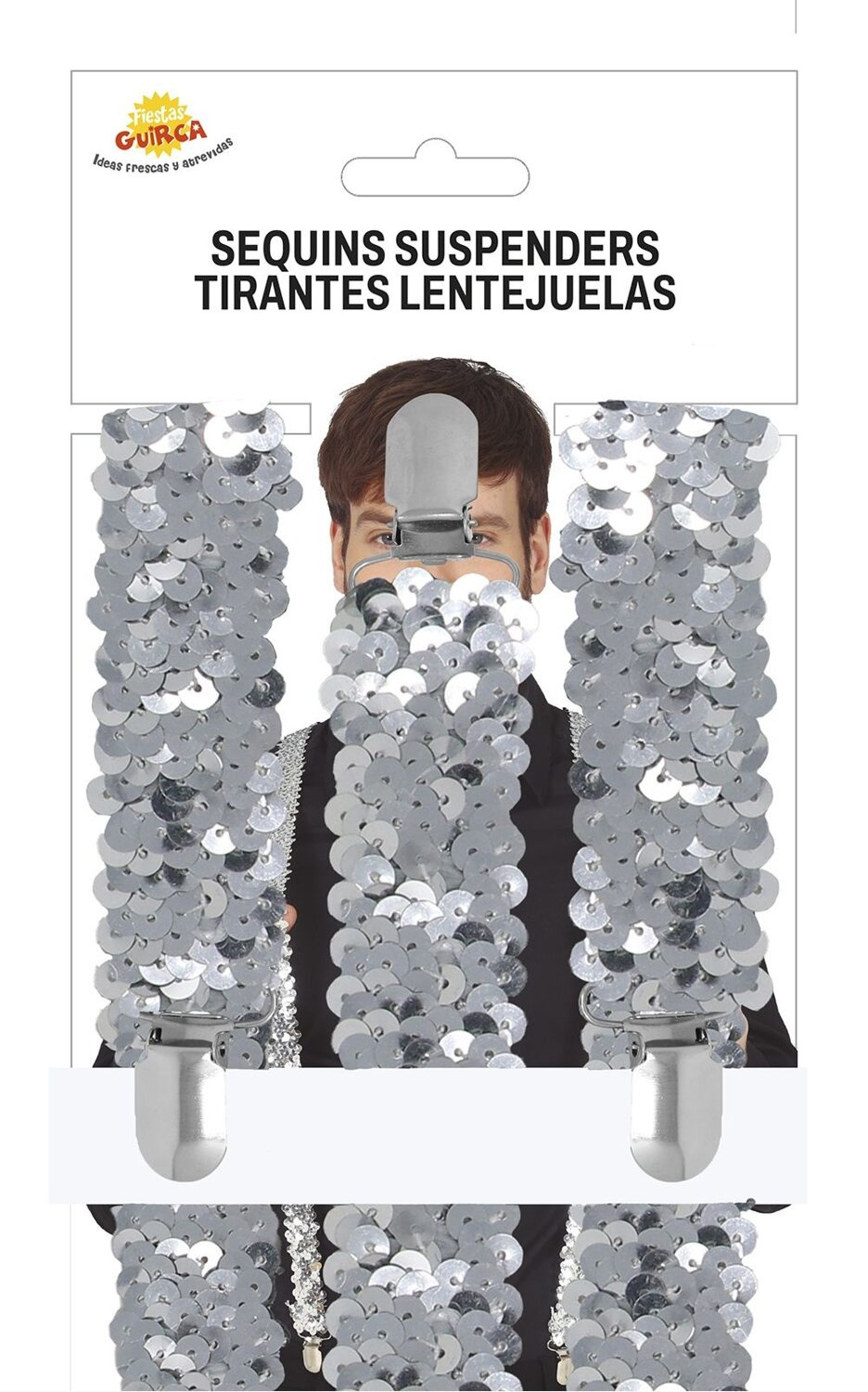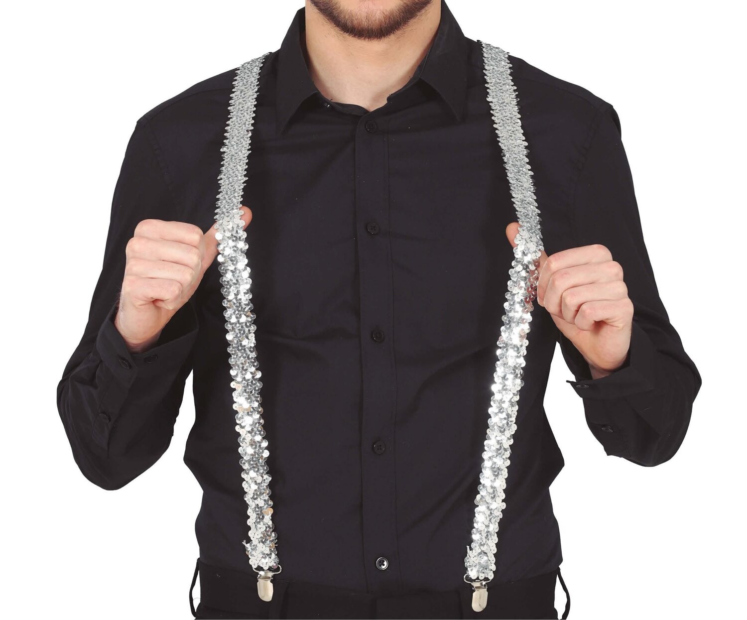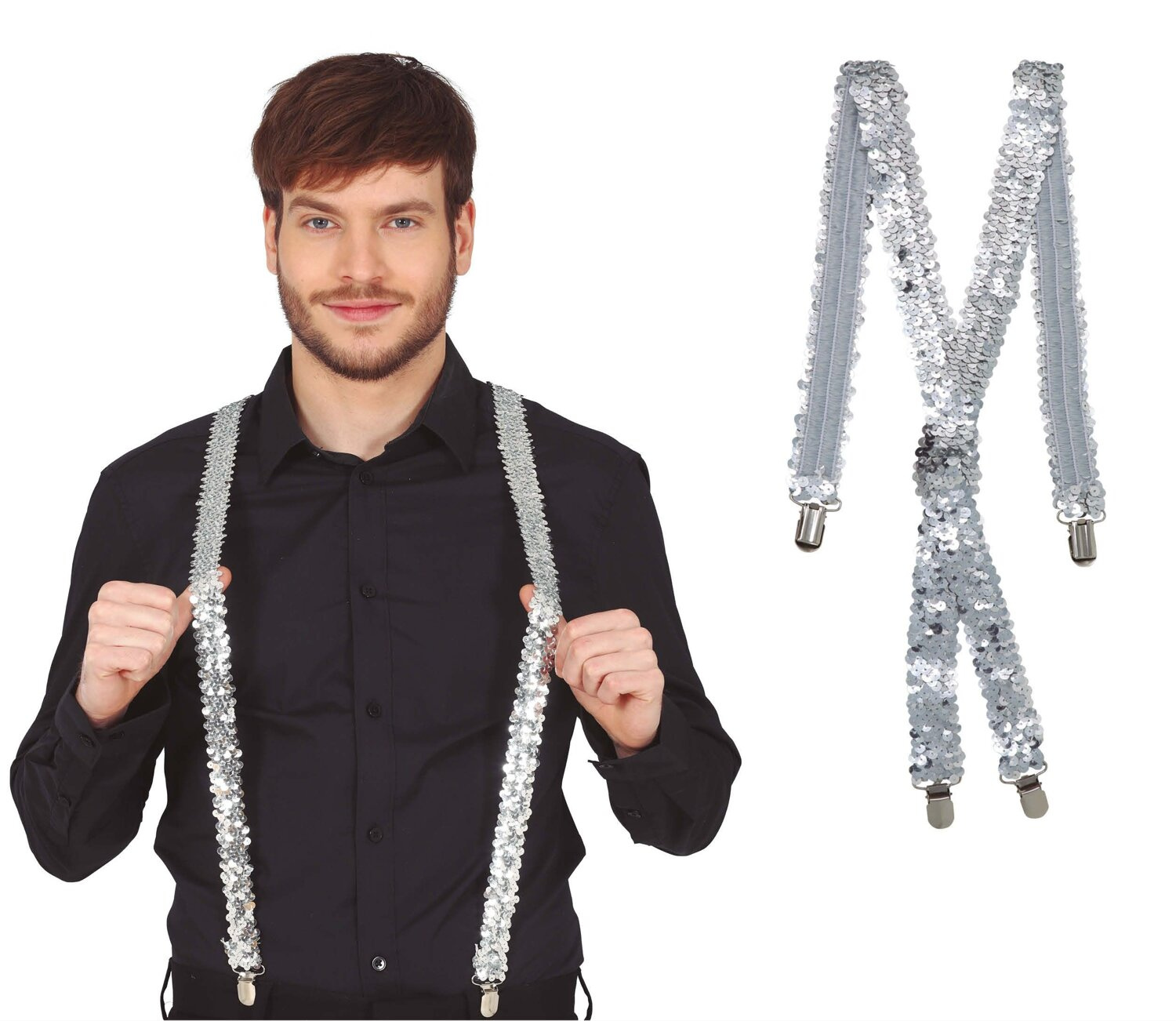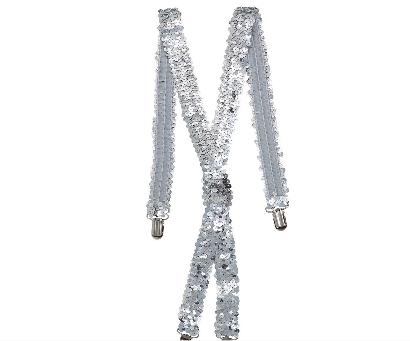 - Srebrne szelki wykonane z gumy o szerokości ok. 3 cm. Posiadają dwie metalowe spinki z przodu oraz dwie z tyłu. Na plecach szelki są zszyte razem. Pokryte połyskującymi cekinami. Super dodatek do stroju eleganta czy na karnawał.