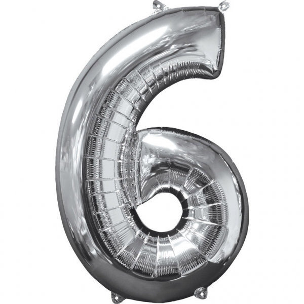 Srebrny balon foliowy w kształcie cyfry 6. Złożony z innymi cyframi tworzy dowolny numer. Znakomity aby podkreślić uroczystość szóstych urodzin bądź rocznicy.