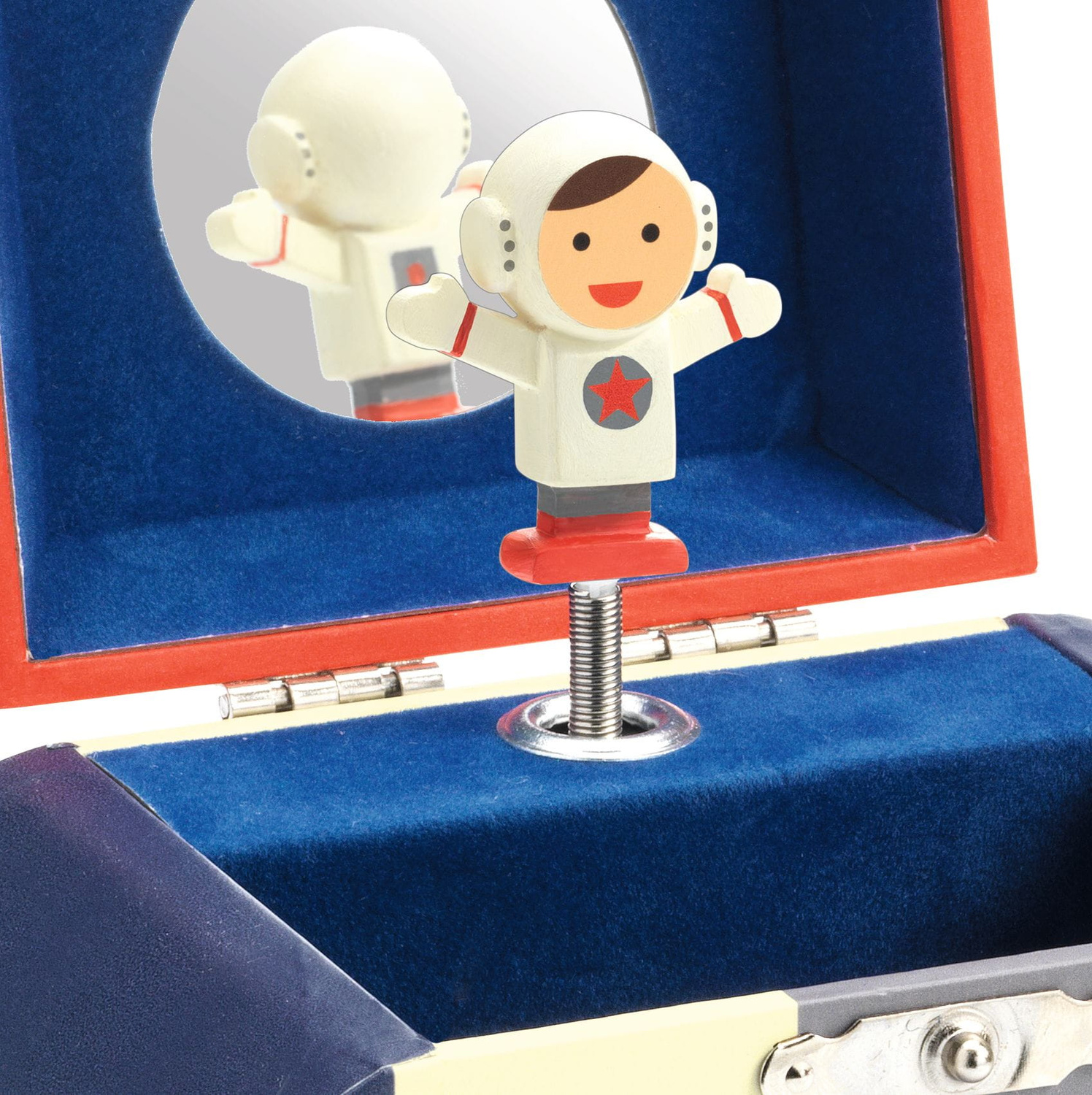 Eleganckie pudełko na drogocenne kosztowności, skarby czy drobne pamiątki z wakacji (np. muszle lub minerały). Szkatułka wykonana jest z drewna w kształcie rakiety kosmicznej, pokryta tekturą w czerwono - granatowym kolorze z nadrukiem astronauty od przodu. Pudełko posiada nakręcany mechanizm z pozytywką, który po otwarciu wieczka gra melodię: "Take me out the Ball game" Alberta Von Tilzera. Wieczko zamykane jest na metalowe zapięcie w złotym kolorze. W środku znajduje się okrągłe lusterko oraz figurka astronauty, która obraca się do muzyki.