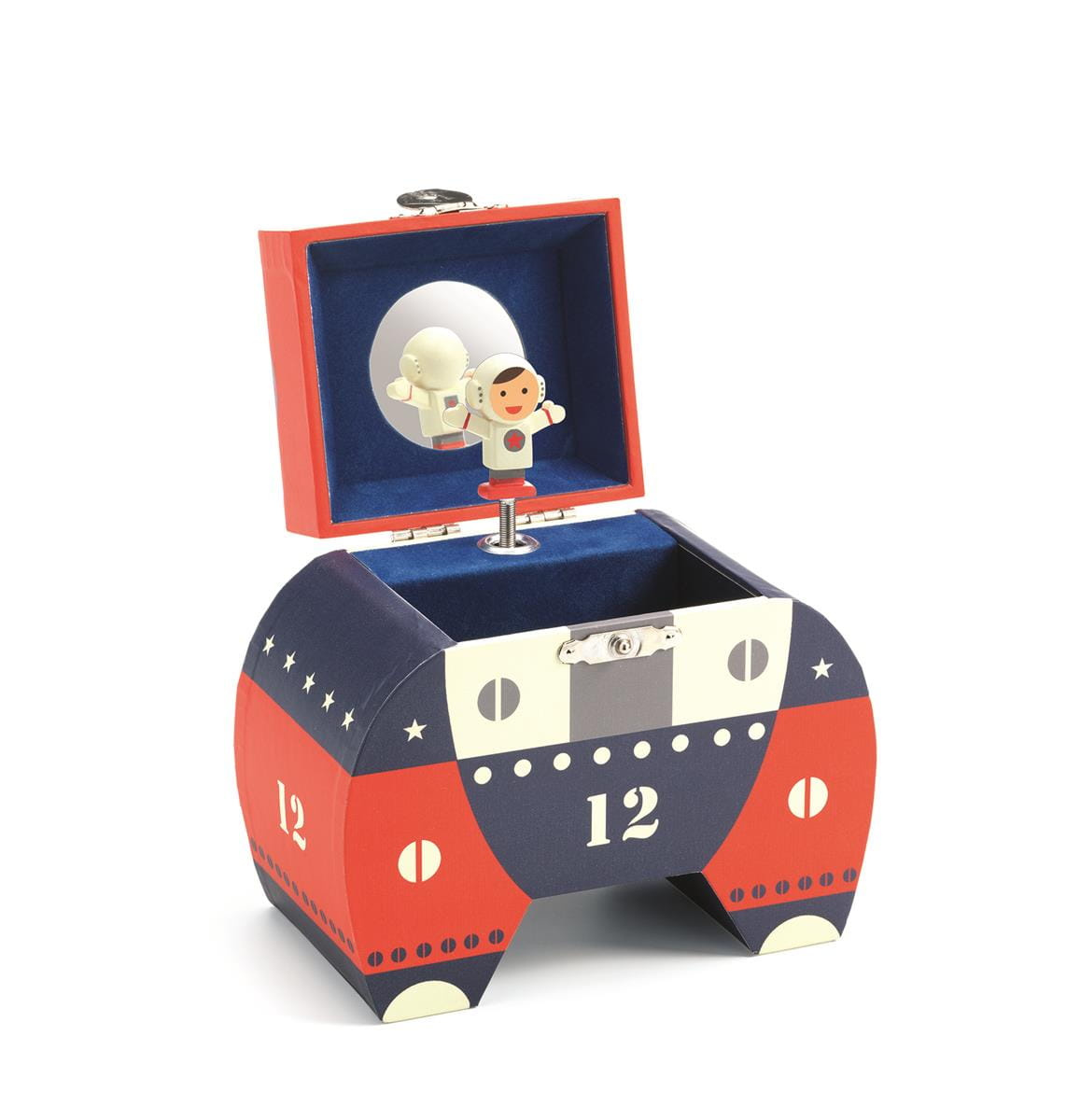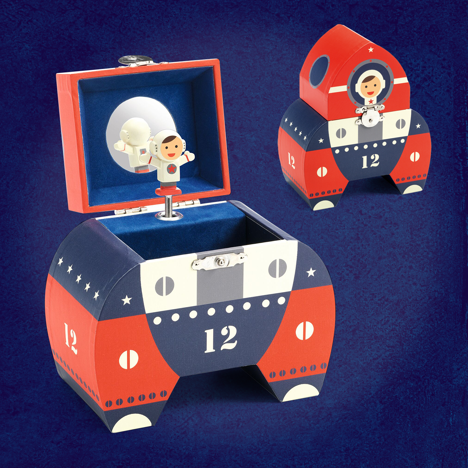 • Pudełko na skarby z pozytywką. Szkatułka jest w kształcie rakiety kosmicznej w czerwono - granatowym kolorze. W środku znajduje się figurka astronauty oraz nakręcany mechanizm, który po otwarciu gra melodię: "Take me out the Ball game"