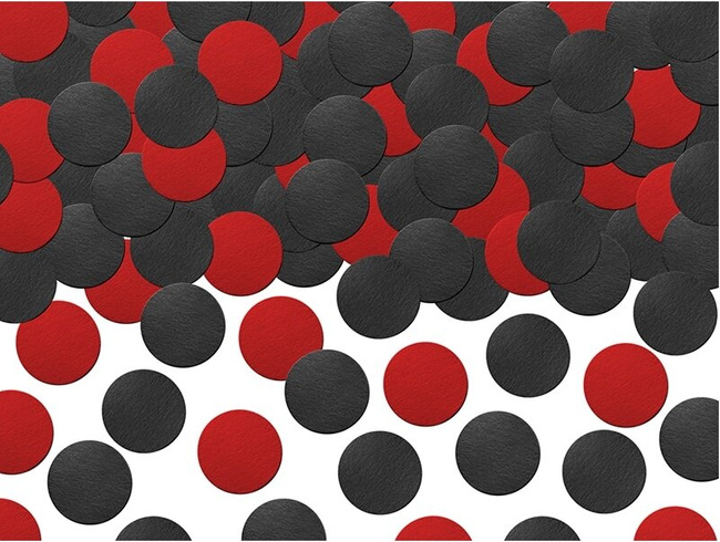 - Tekturowe konfetti okrągłe w czarnym i czerwonym kolorze. Doskonała dekoracja stołu, kredensu w stylu Biedronki, groszki. Znakomicie posłuży także jako ozdoba menu i zaproszeń.