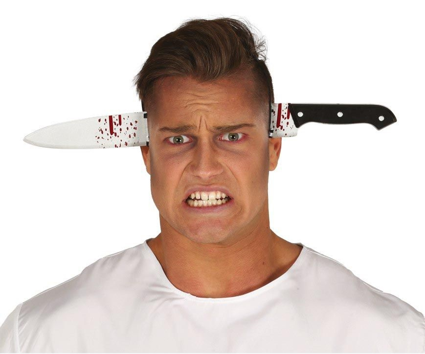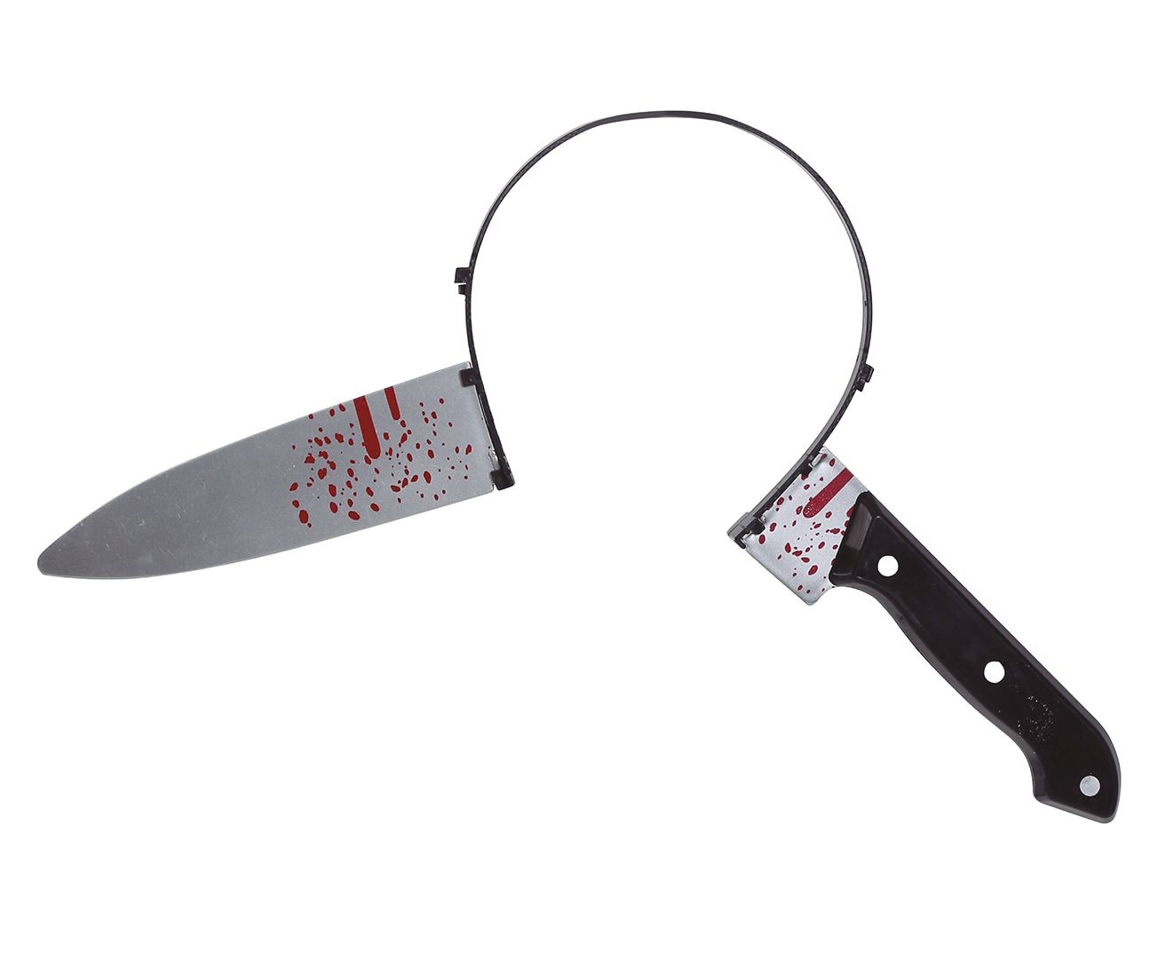 Plastikowa opaska do włosów w czarnym kolorze. Do opaski przyczepiona jest z jednej strony końcówka ostrza z drugiej rączka noża. Opaska jest jednostronna (nadruk z jednej strony, tył pusty). Znakomita do charakteryzacji, wyglądała jak wbity nóż w głowę.