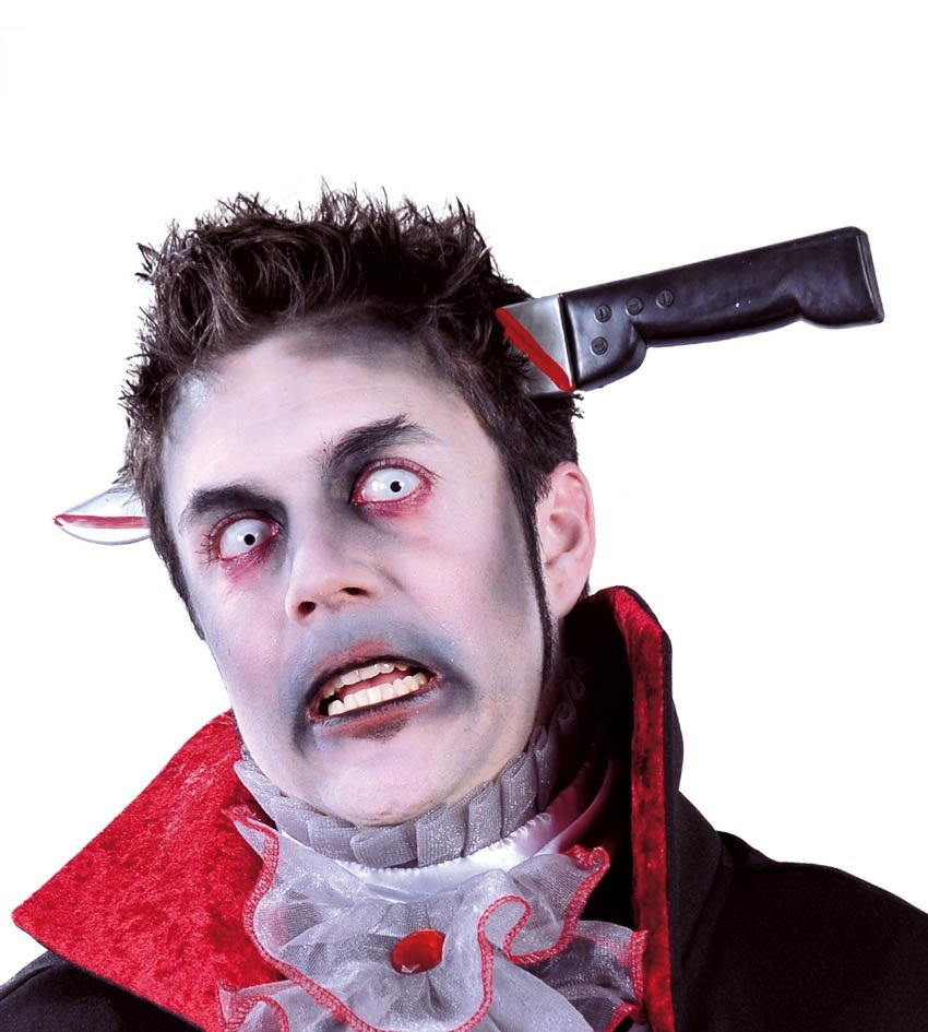 - Plastikowa opaska do włosów w czarnym kolorze. Do opaski przyczepiona jest z jednej strony końcówka ostrza z drugiej rączka noża. Opaska jest jednostronna (nadruk z jednej strony, tył pusty). Znakomita do charakteryzacji, wyglądała jak wbity nóż w głowę.