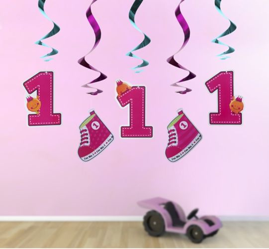 W opakowaniu znajduje się pięć sztuk zakręconych świderków, na dwóch zawieszone są urodzinowe trampki , na trzech różowe cyfry "1".
