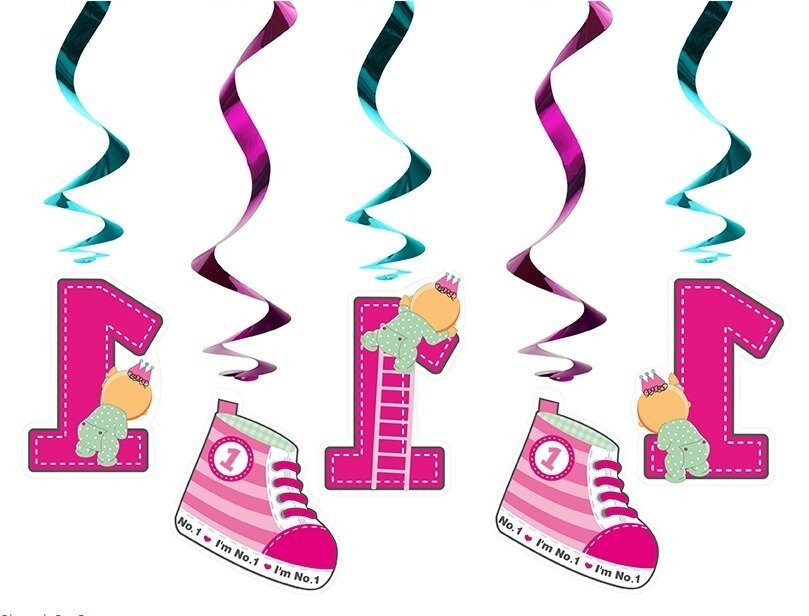 Świderki dekoracyjne na PIERWSZE URODZINKI dziewczynki. Świderki wykonane z błyszczącego tworzywa w zielonym oraz ciemnoróżowym kolorze. Na każdym kręciołku zawieszone są dekoracje w kształcie wesołych malinowych bucików oraz 3 jedynek.