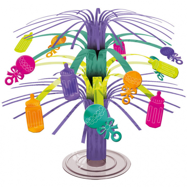 Ozdoba w postaci drzewka - fontanny z błyszczącej foli z zawieszkami w kształcie atrybutów dziecięcych: butelek i grzechotek. Kaskada będzie wyjątkową dekoracją np. na stole na przyjęciach z okazji narodzin dziecka, Baby Shower lub roczku. Znakomita zarówno jako wystrój pomieszczenia dla chłopca jak i dziewczynki.