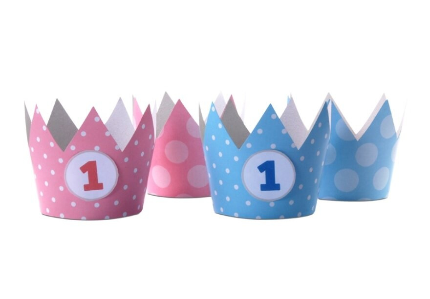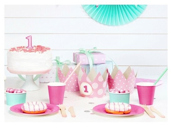 Okrągła tekturka w białym kolorze z nadrukowaną cyfrą 1 w różowym kolorze. Dookoła kremowa obwódka. Dekoracja do samodzielnego naklejenia na czapeczce, koronie solenizanta. Jako dekoracja bufetu, słomek, pudełeczek, paczuszek. Może posłużyć jako konfetti na stole lub dekoracja zaproszeń, winietek lub menu. Cyferkę przykleja się na dołączonej taśmie dwustronnej.