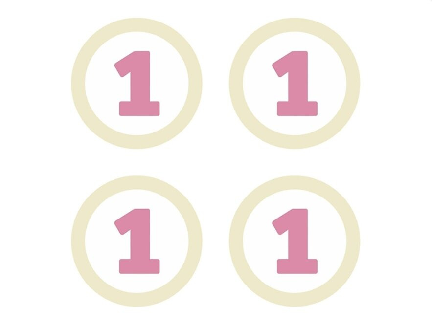 - Okrągła tekturka w białym kolorze z nadrukowaną cyfrą 1 w różowym kolorze. Dookoła kremowa obwódka. Dekoracja do samodzielnego naklejenia na dowolnym przedmiocie. Cyferkę przykleja się na dołączonej taśmie dwustronnej. Opakowanie zawiera 4 sztuki.