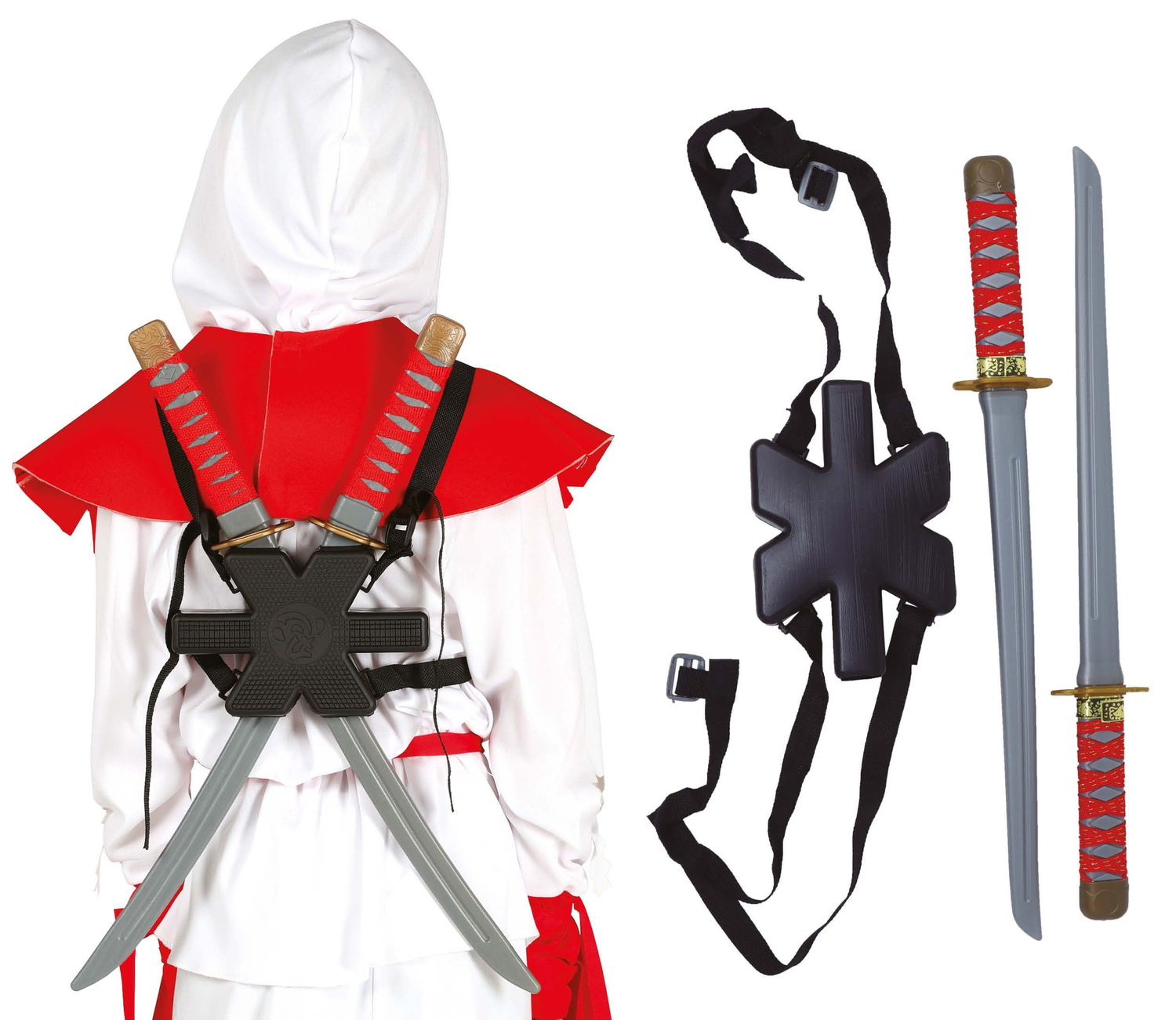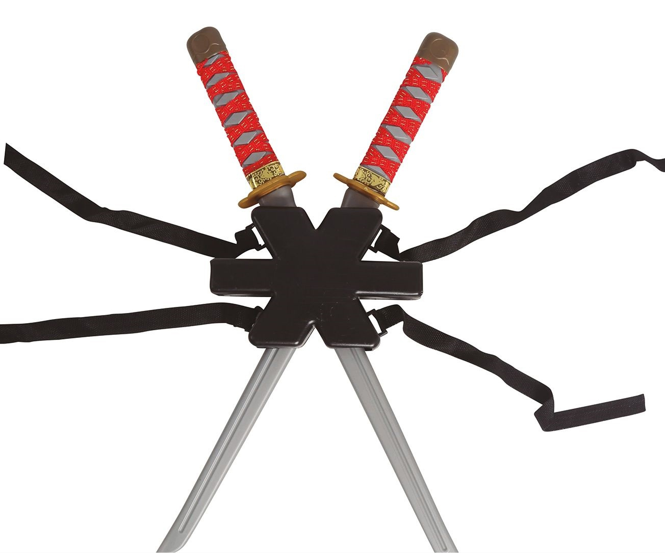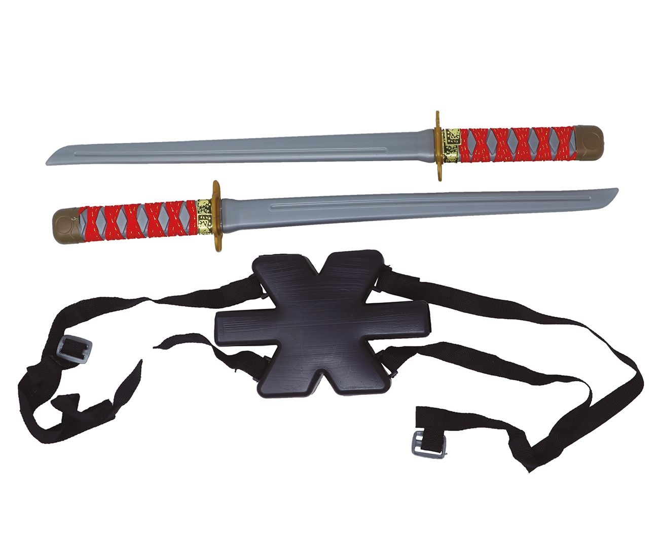 Zestaw dwóch mieczy z uchwytem. Miecze wykonane są z szarego plastiku, na rączkach czerwone tasiemki. Uchwyt zakłada się na plecach jak plecak. Posiada czarne tasiemki z regulacją obwodu.