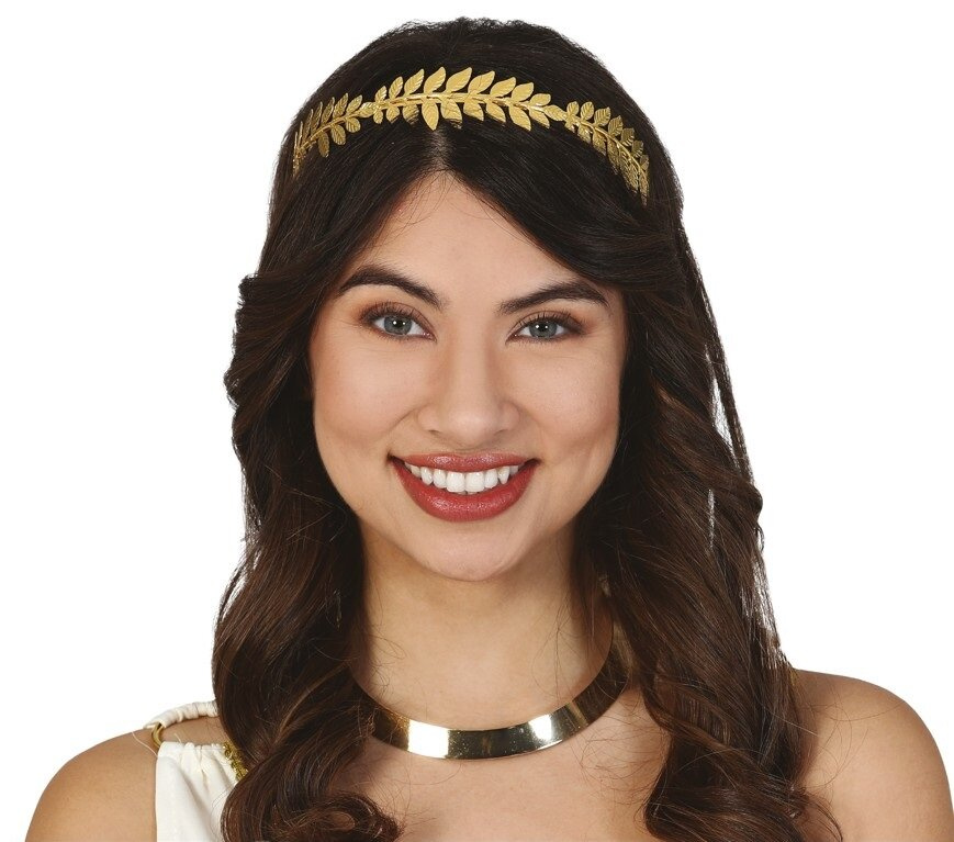 - Opaska do włosów, wykonana z metalu. Na obwodzie opaska ozdobiona jest metalowymi liśćmi, które tworzą wieniec - niczym korona dla starożytnej bogini. Znakomite uzupełnienie stroju Greczynki, Rzymianki lub Olimpijskiej bogini.