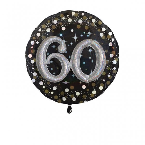 Duży balon w czarnym kolorze wykonany z holograficznej folii. Balon posiada z obu stron srebrny wypukły numer 60 (3D). Bardzo okazały i elegancki, robi wrażenie. Oryginalna dekoracja na sześćdziesiąte urodziny lub rocznicę.