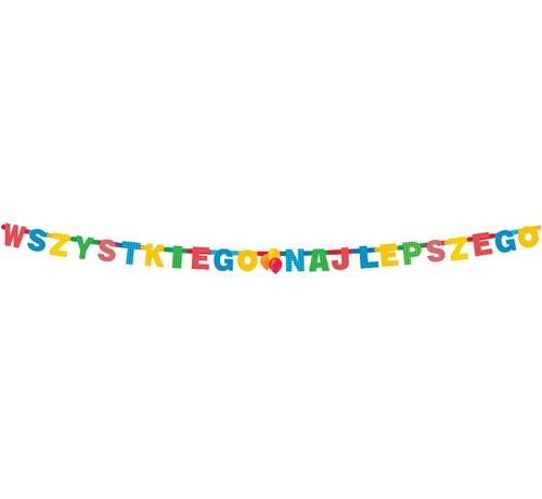 - Bardzo uniwersalny baner do wykorzystania na wiele okazji. Girlanda z połączonych liter, które tworzą napis: WSZYSTKIEGO NAJLEPSZEGO. Litery wykonane z kolorowej tektury z jednostronnym nadrukiem.