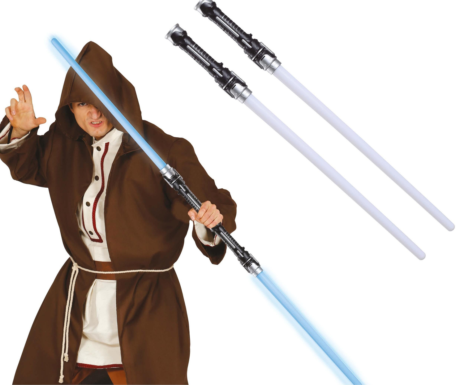 • Miecze świetlne w białym kolorze, posiadają rękojeść z możliwością łączenia i utworzenia kija świetlnego. Zasilane na baterie 3 x AAA (nie zawarte w zestawie). Niezbędny dodatek do kostiumu sience-fiction, a także do zabaw w Gwiezdne Wojny.