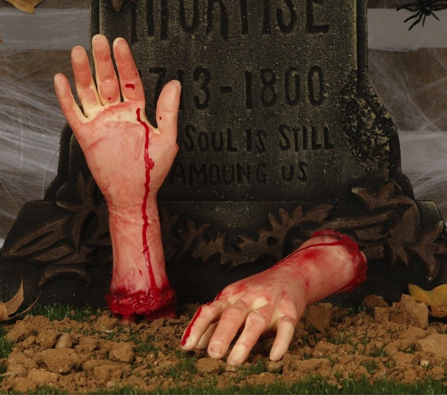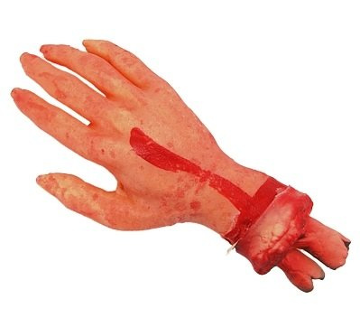 Sztuczna, ucięta ludzka dłoń. Idealna do charakteryzacji na Halloween lub jako element dekoracji. Kończyna wykonana z gumy. Na końcu dłoni wystają dwie zakrwawione kości.