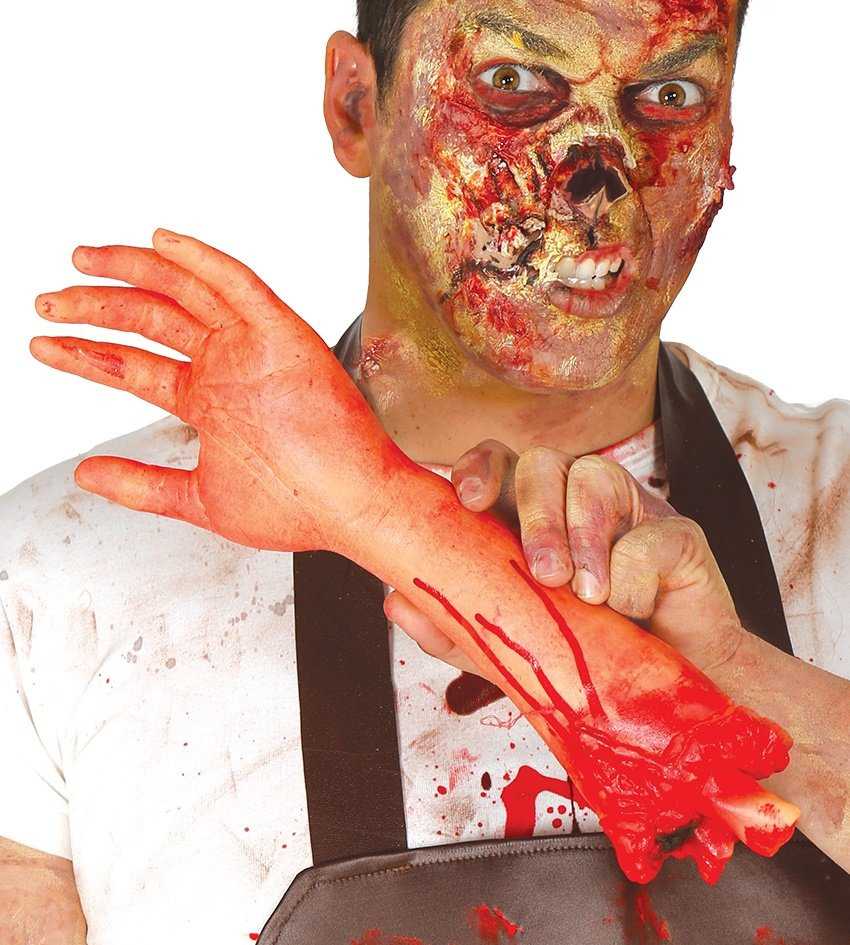 - Sztuczna, ucięta ludzka dłoń. Idealna do charakteryzacji na Halloween lub jako element dekoracji. Kończyna wykonana z gumy. Na końcu dłoni wystają dwie zakrwawione kości.