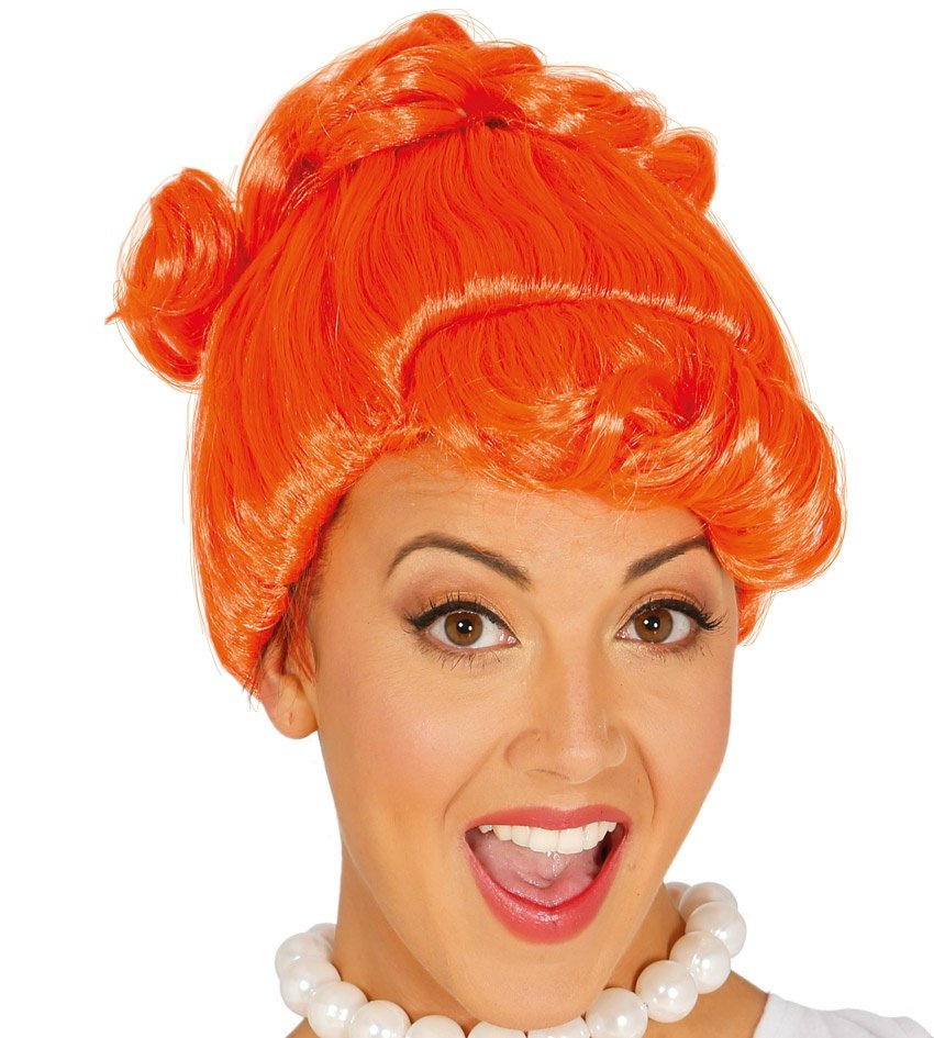 - Peruka w kolorze pomarańczowym, fryzura zaczesana w koka z grzywką. Idealny dodatek do stroju filmowej Wilmy Flinstone, mieszkanki jaskini czy rudej kokietki.