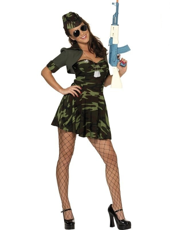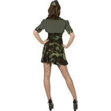 Przebranie odważnej żołnierki składa się z sukienki w kolorze moro. Sukienka uszyta jest z elastycznej lycry, noszona na sylikonowych ramiączkach. Góra dopasowana z usztywnionymi miseczkami i srebrną, materiałową gwiazdką na prawej piersi. Posiada rozkloszowaną spódnicę. W pasie od tyłu gumka, przez co ładnie dopasowuje się do sylwetki.