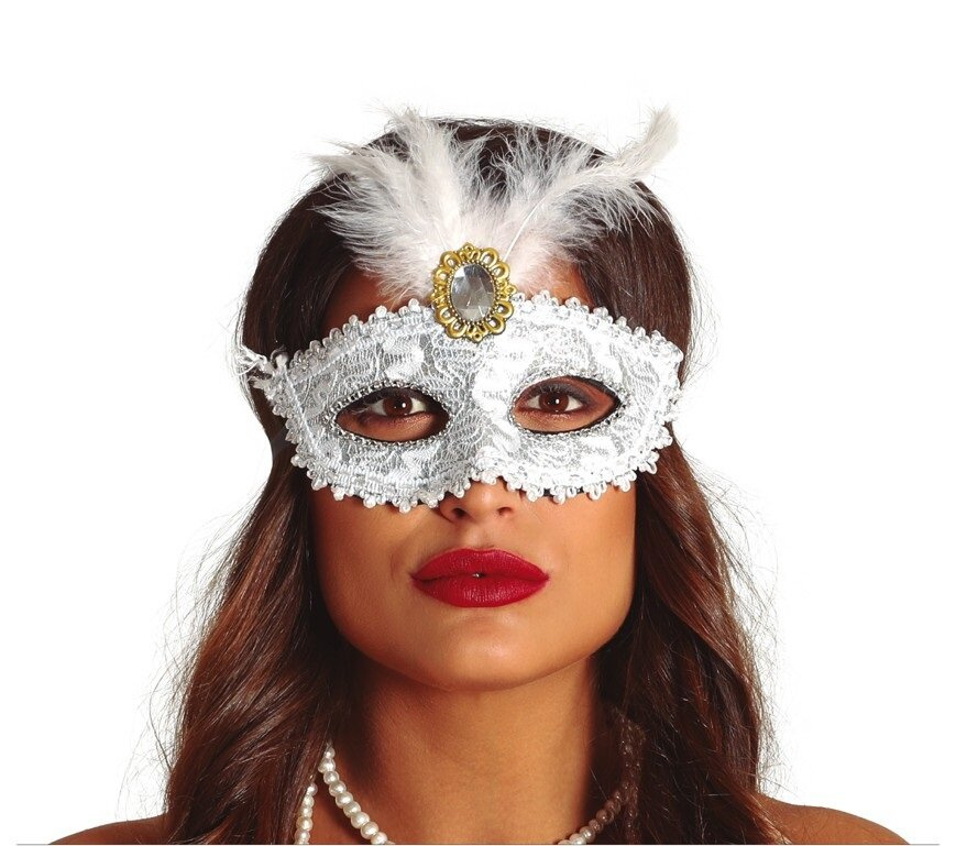 Bardzo elegancka maska karnawałowa idealna na bal maskowy. Maska jest wyprofilowana, aby dobrze dolegała do twarzy. Wykonana z tworzywa, które pokryte jest materiałem, typu koronka w białym kolorze ze srebrną nitką. Dookoła ozdobiona tasiemką, a wokół oczu srebrnymi dżetami. Na czole białe piórka z kamykiem. Maska mocowana jest na tasiemki wiązane wokół głowy.