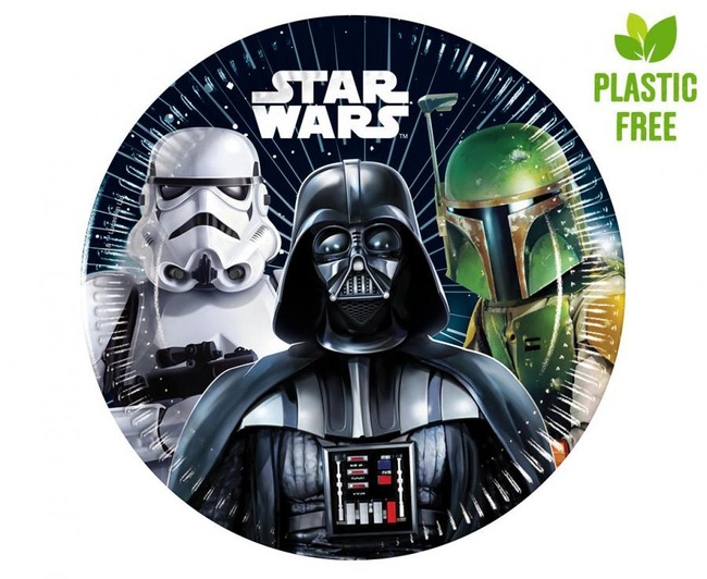 Talerze jednorazowe z serii "Star Wars Galaxy". Talerzyk jest okrągły z motywem z "Gwiezdnych Wojen". Na pierwszym planie znajduje się postać Dartha Vadera, a po jego bokach widoczni są szturmowiec (Stormtrooper) oraz Boba Fett, każdy w swoim charakterystycznym stroju. Tło ma gwiezdny motyw, co podkreśla tematykę kosmiczną. Powierzchnia talerzy jest gładka, obrzeże karbowane, posiadają lekkie wgłębienie ok 1,5 cm. Idealne do tortu, kanapek, ciasteczek, owoców oraz przekąsek na przyjęcia nie tylko dla dzieci ale również dla dorosłych zafascynowanych Gwiezdnymi Wojnami.