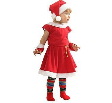 Sukienka małej Mikołajki z krótkim rękawkiem. Sukienka uszyta z miłego miękkiego materiału w kolorze czerwonym, dekolt oraz dół spódniczki zdobi białe futerko. W pasie wyszyta jest gumka dla lepszego dopasowania, którą na przedzie zdobi złoty sznureczek zawiązany w kokardkę zakończony złotymi dzwoneczkami. Sukienka zapinana jest z tyłu na zamek błyskawiczny. Kostium uzupełnia czerwona czapka Mikołaja zakończona dużym białym pomponem. Na obwodzie obszyta jest białym miękkim futerkiem.
