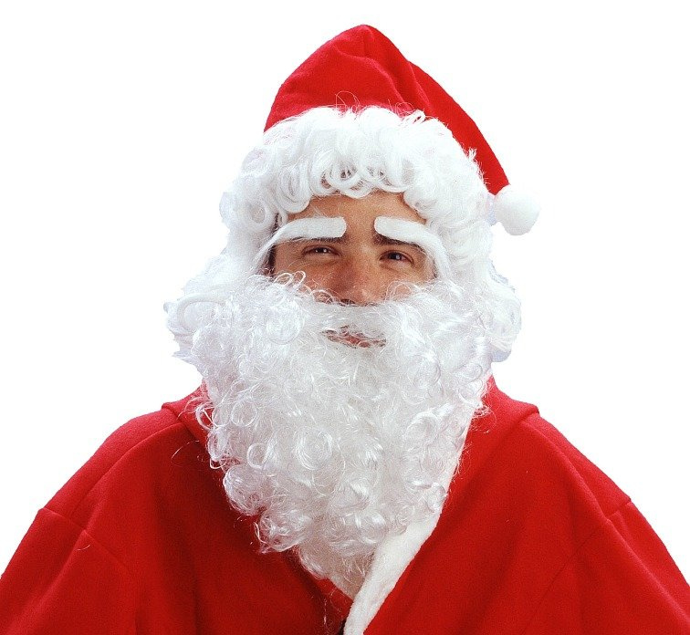 Broda Mikołaja w kolorze białym, włosy kręcone. Posiada otwór na usta. Po bokach wszyte są białe gumki pozwalające przyczepić brodę do uszu aby nie spadała. Broda podszyta jest białym materiałem aby włosy nie drapały.