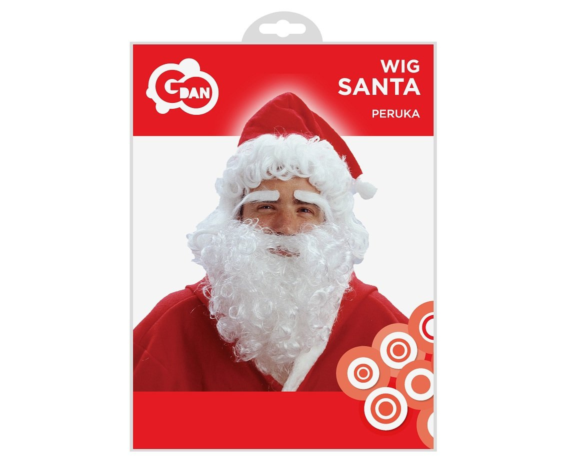 Peruka z Czapką Mikołaja - czapka wykonana z czerwonego filcu z doczepionym białym pomponem o średnicy ok 4cm. Tył i boki czapki wykończone są białymi kręconymi włosami o długość ok 10cm.