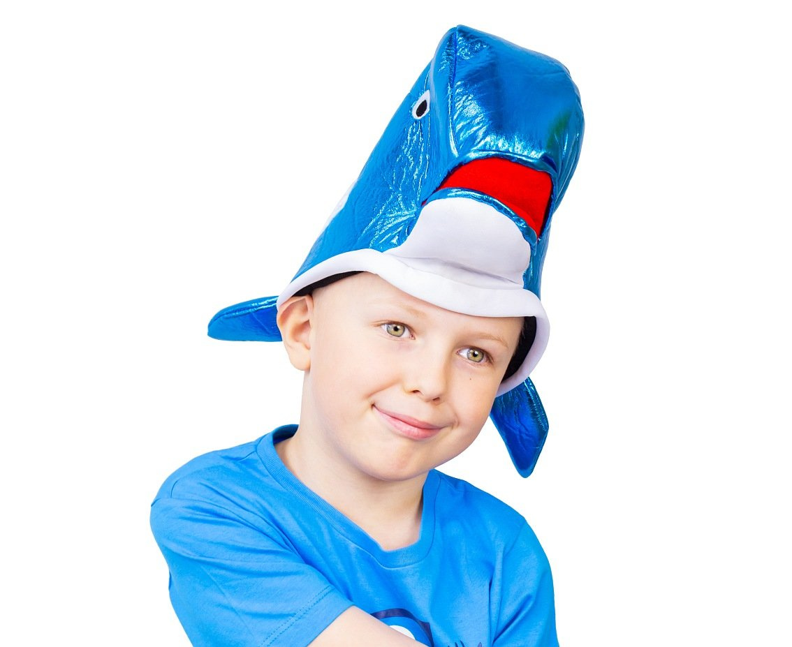 - Czapka na głowę w kształcie niebieskiego delfina. Czapka jest lekko usztywniona, wypełniona watoliną. Posiada wyprofilowane usta oraz płetwy. Nakrycie głowy wykonane jest z połyskującego materiału. Znakomite dopełnienie przebrania ryby czy delfina.