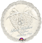 Balon foliowy dla Młodej Pary z okazji ślubu, średnica 18" (45cm). Balon jest w kolorach biało srebrnych w kształcie okręgu, posiada nadruk kwiatowego serca z obrączkami oraz napis: Best Wishes on your Wedding Day. Doskonały prezent z okazji ślubu. Balon przeznaczony do napełniania helem - pięknie unosi się w powietrzu.