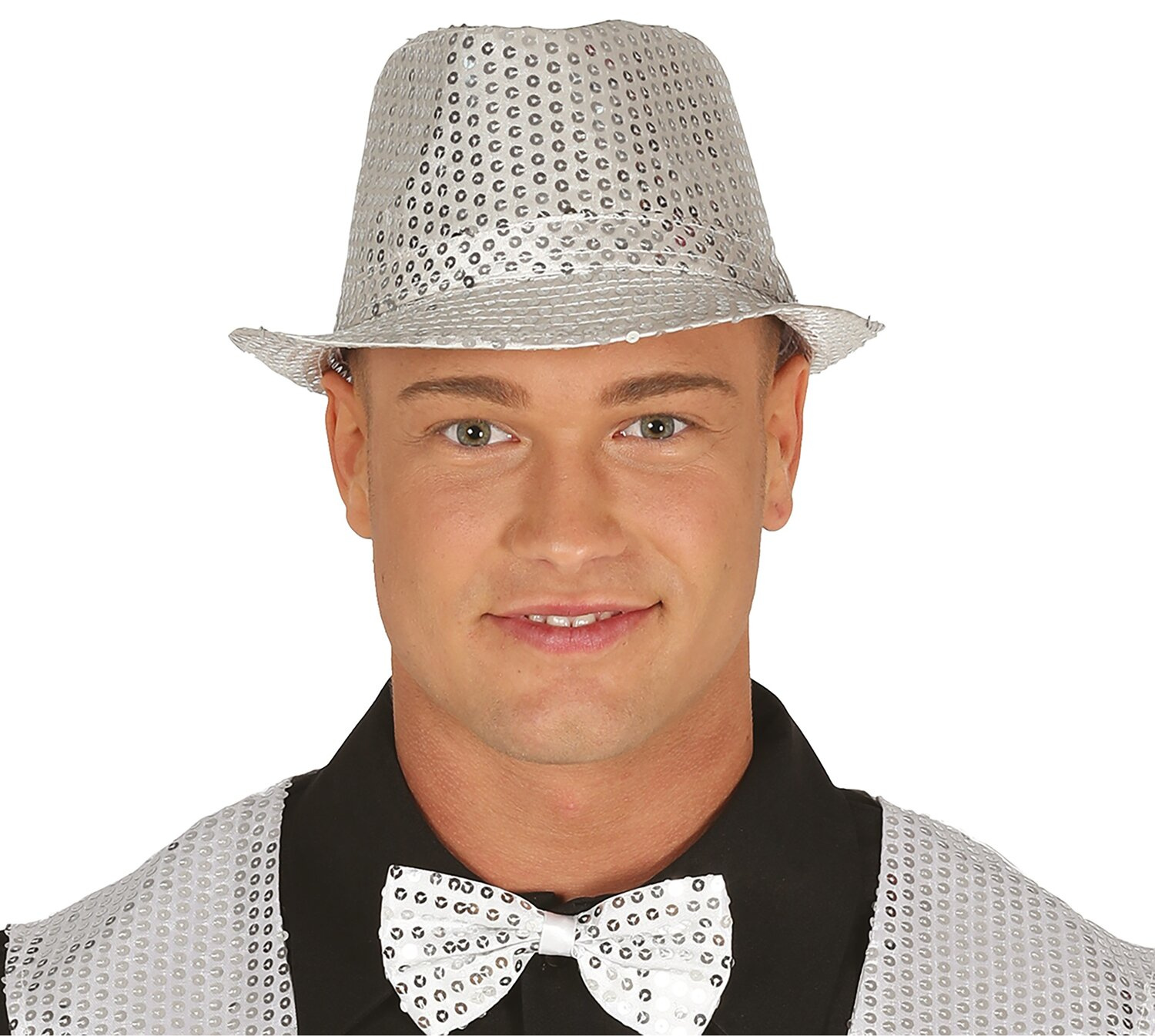 - Kapelusz wykonany z srebrnego satynowego materiału, obszyty jest połyskującymi cekinami. Usztywniony i wyprofilowany dobrze wykonany. Podszewka kapelusza jest wykonana z białego materiału.