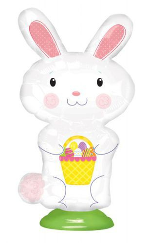 - Balon foliowy w kształcie króliczka trzymającego koszyczek z pisankami. Balon ma wymiary 17 x 29cm, nadaje się do pompowania powietrzem i umieszczenia na zielonej plastikowej podstawce, dzięki której ładnie stoi i nie przewraca się.