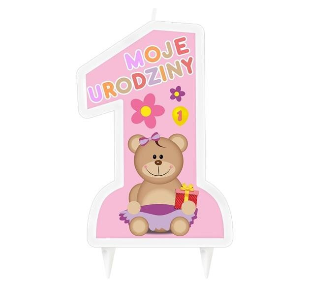 Świeczka urodzinowa w kształcie cyferki 1. Na świeczce znajduje się nadruk misia w fioletowej spódniczce z prezentem oraz napis "Moje Urodziny". Z jednej strony świeczuszka jest różowa z drugiej biała. Mocowana na torcie urodzinowym na dołączonych plastikowych podstawkach.