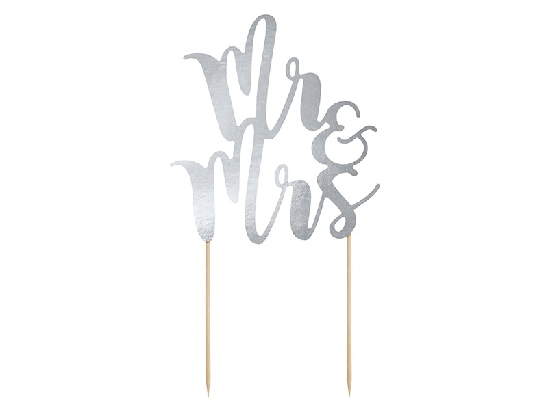 Dwa pikery trzymające napis "Mr & Mrs". Wykałaczki wykonane są z drewna o długości 13 cm. Napis połączony wykonany z srebrnej połyskującej tektury, tył biały. Znakomita dekoracja tortu, wypieków, koreczków na przyjęciu weselnym lub zaręczynowym.