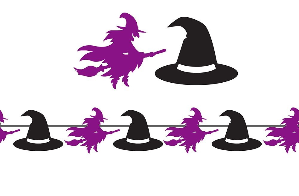 - Efektowna girlanda halloweenowa składa się z naprzemiennie ułożonych sylwetek fioletowych czarownic na miotle oraz czarnych kapeluszy wiedźmy. Długość ok 300 cm