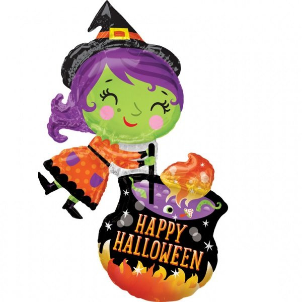 Balon foliowy w kształcie czarownicy, która miesza miksturę w saganie. Eliksir składa się z fioletowego płynu z dodatkiem oka, glizd, muchomora i innych tajemnych składników. Na kotle widnieje napis: Happy Halloween. Wiedźma ma zieloną skórę, fioletowe włosy i bardzo uradowaną minę. Balon będzie znakomitą dekoracją na Halloween, zwłaszcza dla dzieci. Przyjemna oku dekoracja na straszne święto.