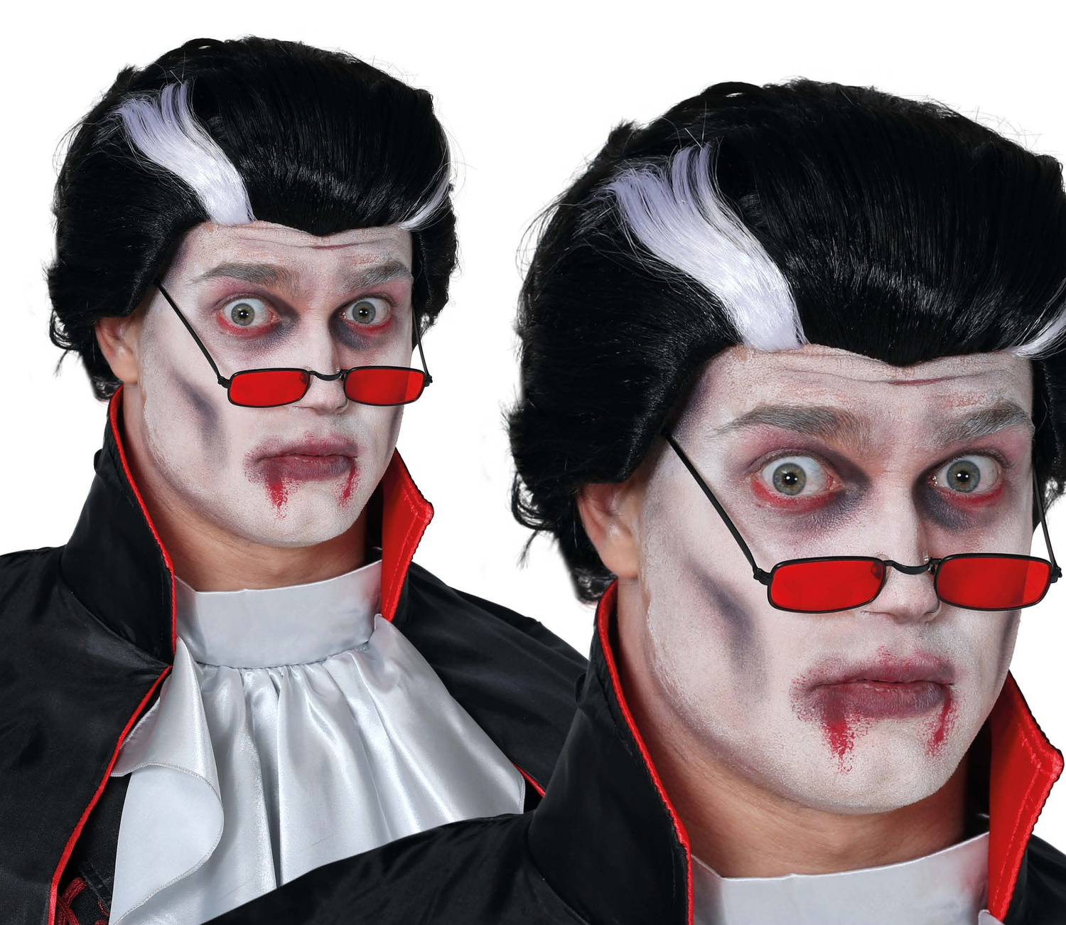 Włosy czarne zaczesane do tyłu, po bokach powyżej skroni białe pasemka - odrosty. Fryzura połyskująca. Peruka na obwodzie posiada gumkę przez co lekko się rozciąga oraz podszewkę w postaci czarnej siateczki, dzięki której głowa lepiej oddycha. Peruka będzie idealnym dodatkiem na bal przebierańców do kostiumu Hrabiego Draculi Monte Christo, wampira, a także jako fantazyjny gadżet na wieczór kawalerski, Sylwestra czy Andrzejki.
