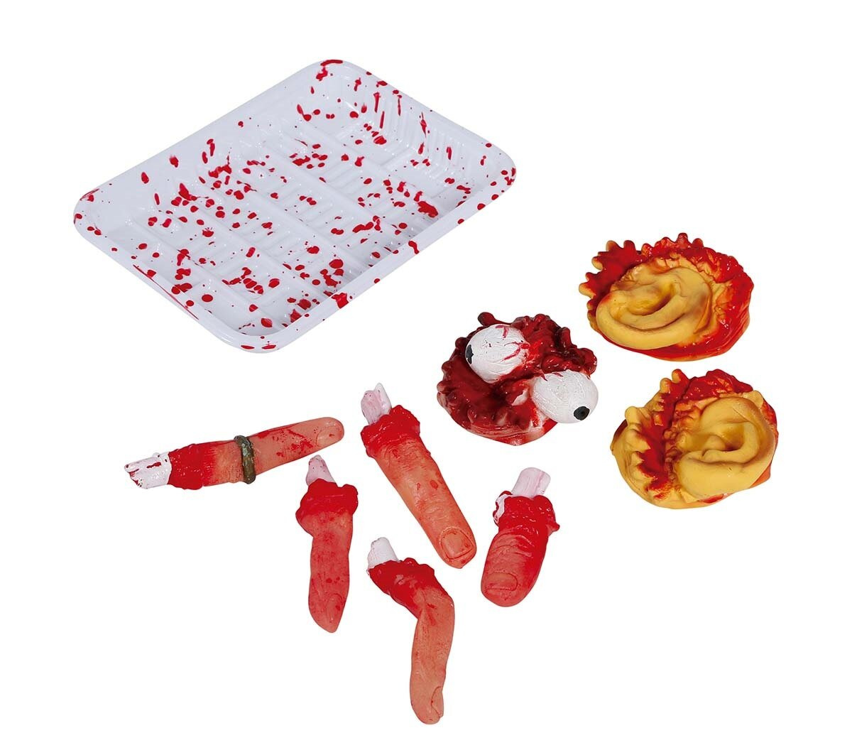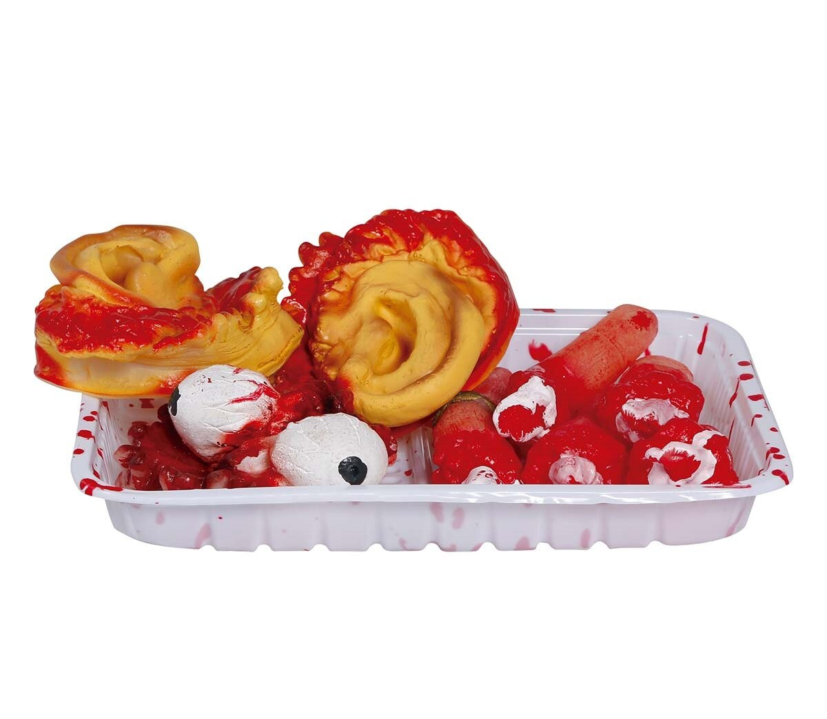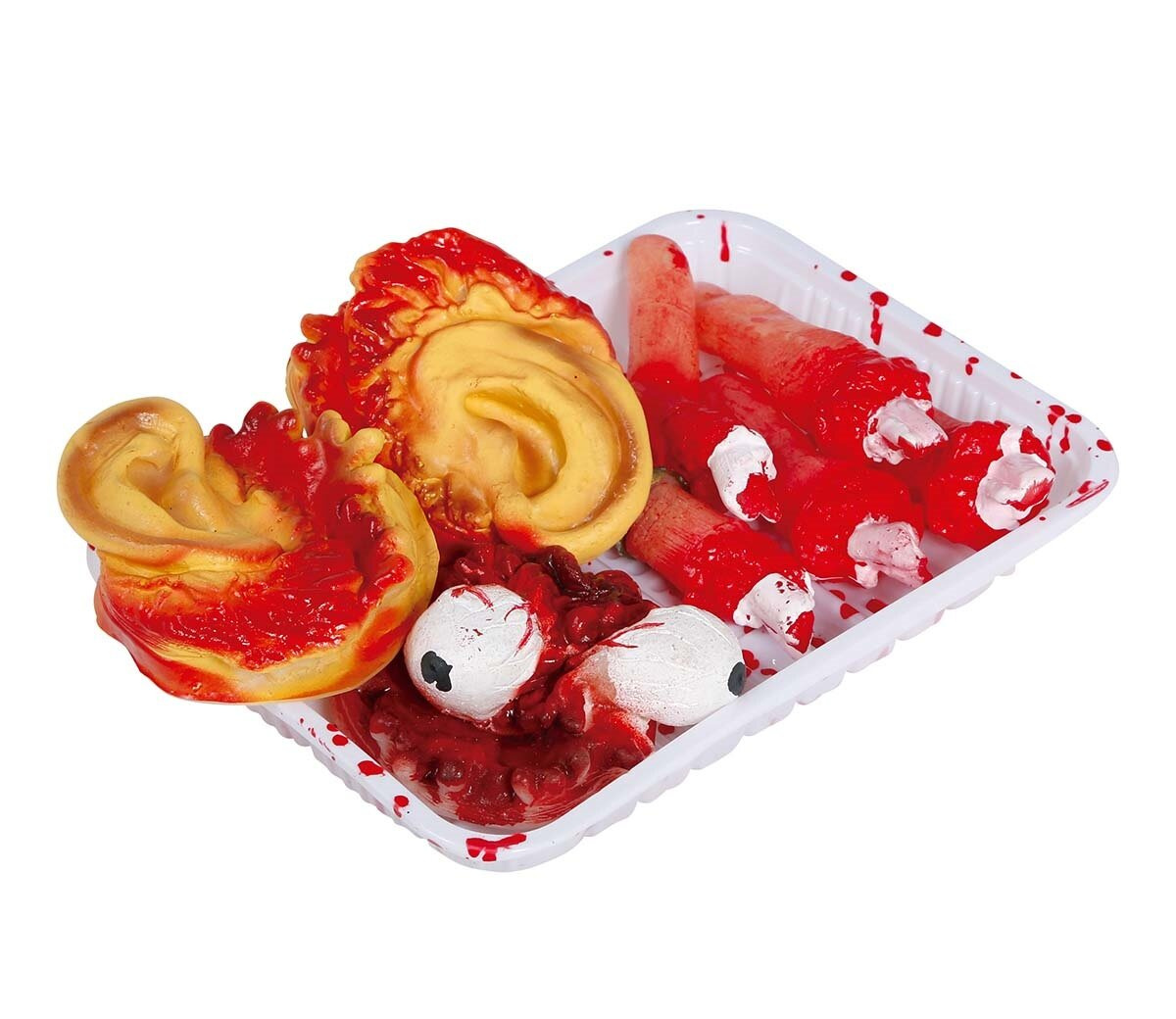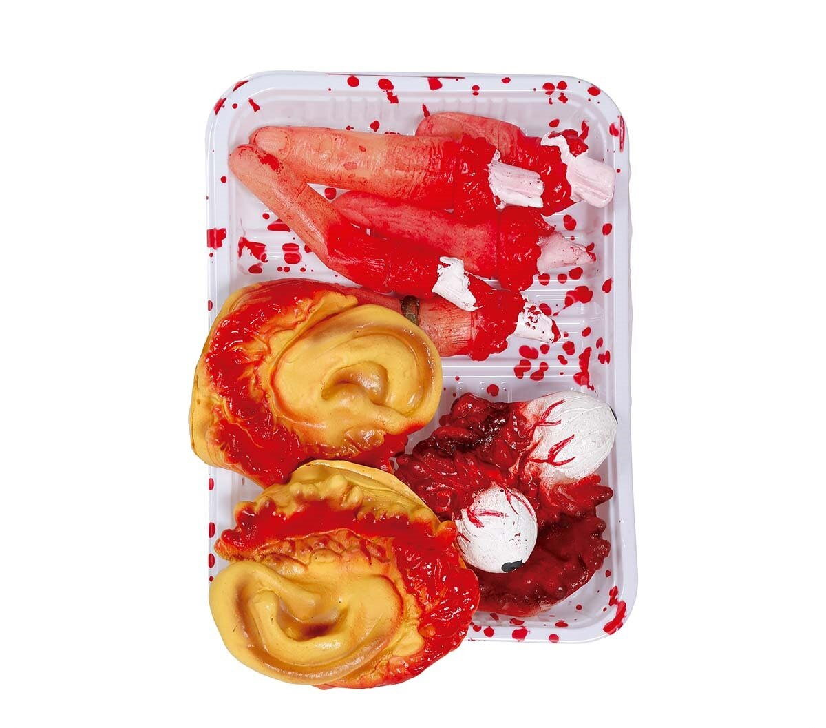 Części ciała wykonane są z miękkiej gumy, umieszczone na plastikowej tacce. Naczynie ubrudzone jest sztuczną krwią. Doskonała dekoracja podczas mrocznej imprezy z okazji Halloween lub w tematyce horroru, filmowej np. Piła. Zaskoczą gości na stole między jedzeniem lub jako fragment dekoracji talerza.